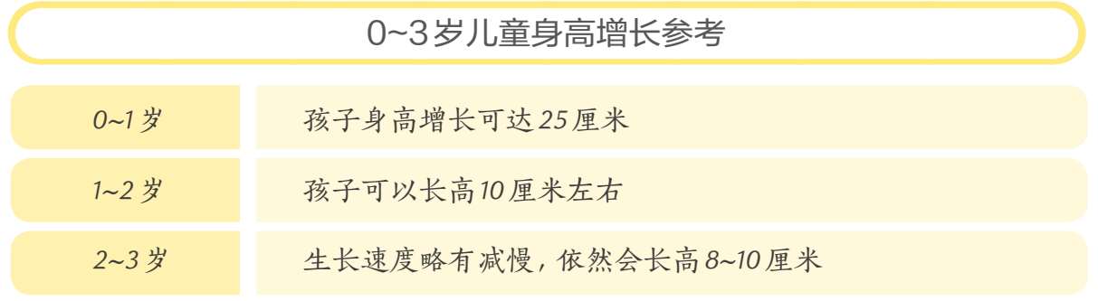 0~3岁是孩子生长的第一个黄金期。 孩子从呱呱坠地到翻身、爬行、走、跑,可以说一天一个样,身高也是飞速增长。这个阶段,家长要做好身高记录,如果孩子的生长曲线百分位在50以上,可以继续保持,如果过低,哪怕是在正常范围内,仍说明孩子距离制订的“目标身高”较远,可以咨询专科医生,获得一些有益的建议。