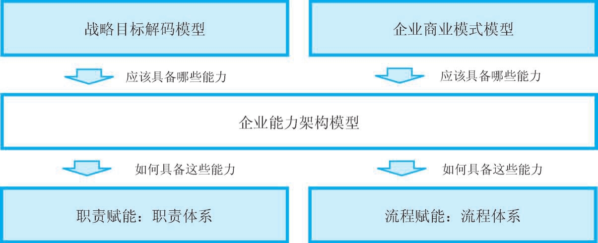 那么,企业如何知道自身应该具备哪些能力?企业又可以通过哪些途径进行赋能?如图1-2所示,EBPM方法论认为,企业需要具备哪些能力,取决于其战略目标和商业模式。企业赋能的途径主要有两条,一是通过职责体系赋能,二是通过流程体系赋能。而<企业能力架构模型>则处于承上启下的关键位置。