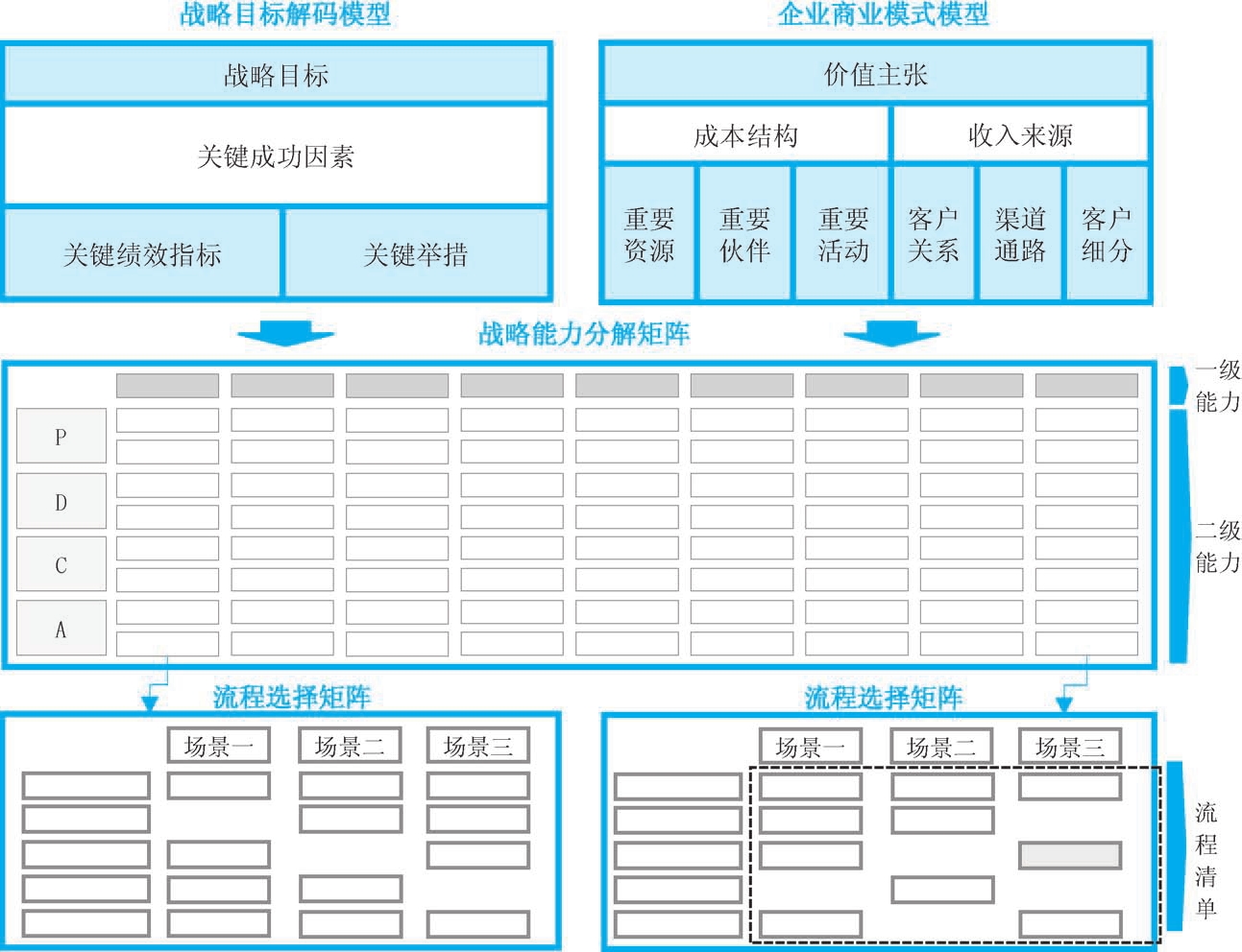 在<战略能力分解矩阵>的基础上,针对每一个<二级能力项>,通过图1-5所示的<流程选择矩阵>可以得到职能流程清单。基于职能流程清单将流程图构建完成后,相当于将一个具体的能力事项分解为一组关联的业务活动,并落实到了人或系统,从而通过能力-流程-角色-人或系统这一途径实现了“赋能”。