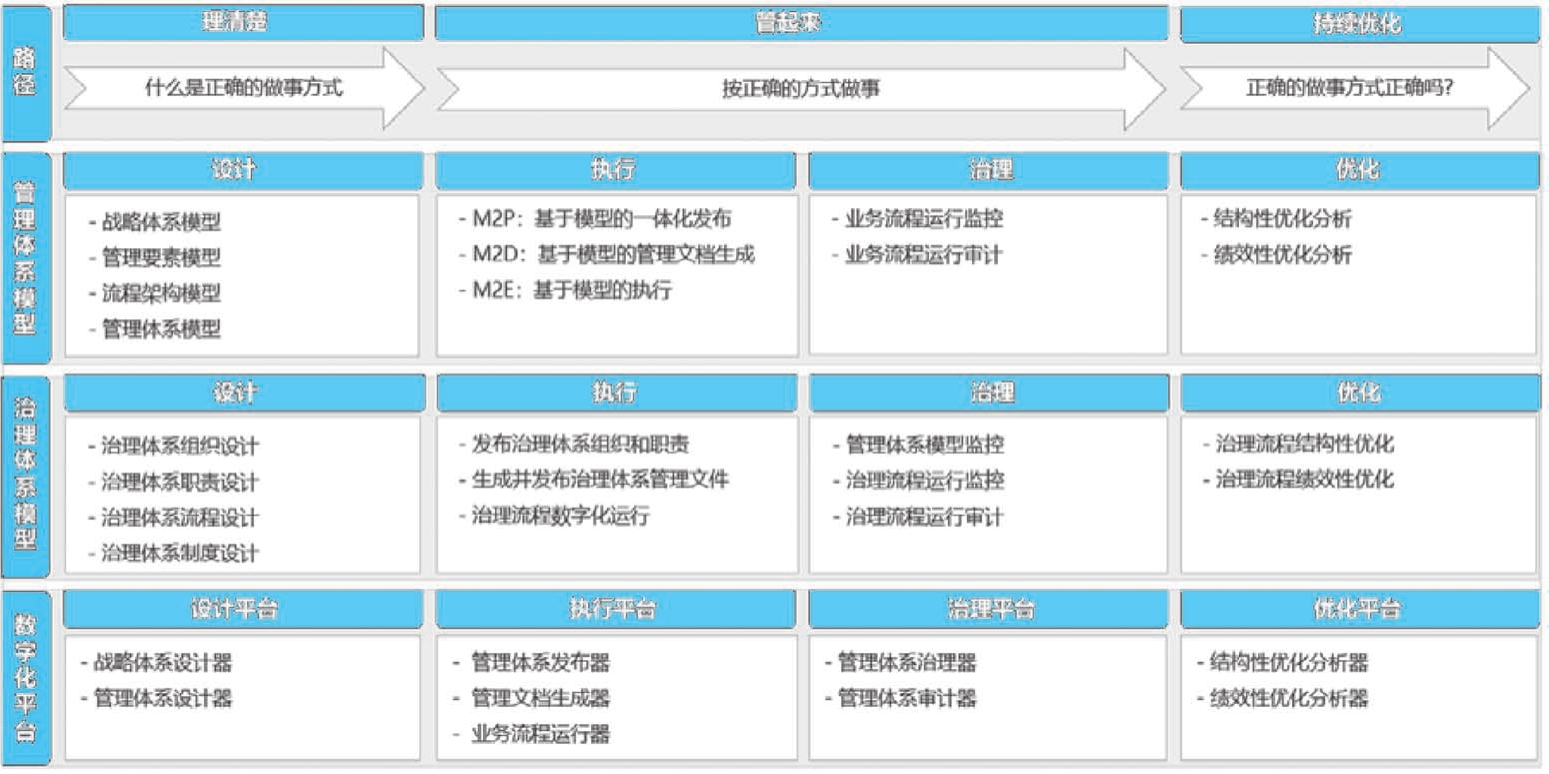 ● 治理体系模型: 针对数字化的管理体系模型构建管理这套模型的治理体系模型。数字化的治理体系模型包括治理体系组织模型、治理体系职责模型、治理体系流程模型和治理体系制度模型。治理体系模型回答了数字化流程管理的第二个命题,即“怎么管”。