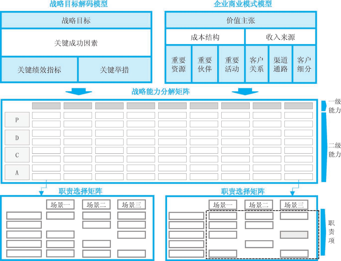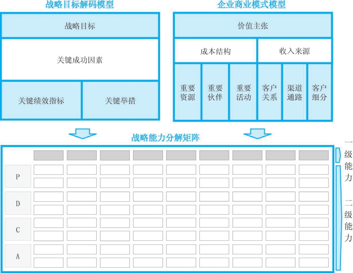 如图1-3所示,企业的<一级能力项>是通过承接<企业商业模式模型><战略目标解码模型>而来的,<二级能力项>则是通过PDCA四个阶段将<一级能力项>进行细分拆解而得。通过<战略能力分解矩阵>可以回答企业应该具备哪些能力这个问题。