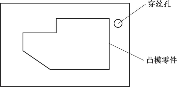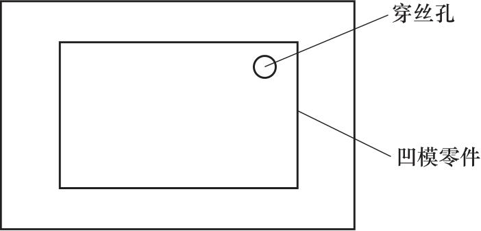 当切割带有封闭型孔的凹模工件时,穿丝孔位于凹形的中间某处临近加工起点的位置操作最为方便,如图3-3所示。因为这既便于穿丝孔加工位置准确,又便于控制坐标轨迹的计算。