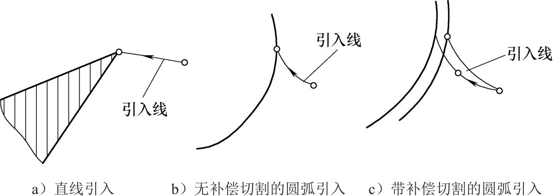 在线切割加工中,进刀点通常与工件切割起点不重合,这就需要一段从进刀点到切割起点的引入切割段。当切割起点选在切割图形的交点上时,引入切割段通常采用直线方式;当切割起点选在切割图形的表面上时,对于无补偿的切割,引入切割段通常采用圆弧方式,并与切割起始段相切;对于带补偿的切割,一般引入切割段在圆弧方式引入前需增加用于建立补偿的直线段,如图3-5所示。