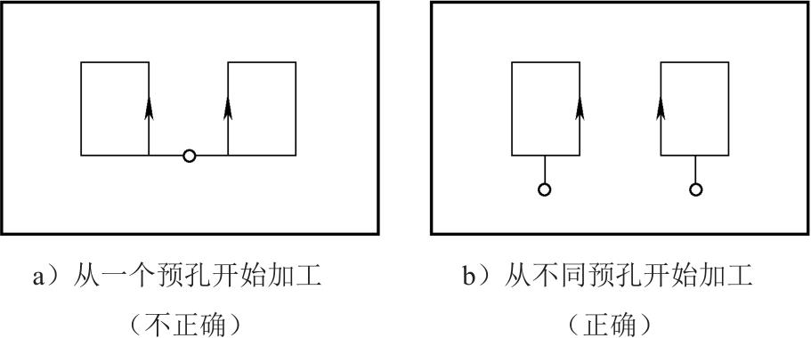 4)在一块毛坯上要切出两个以上零件时,不应连续一次切割出来,而应从不同预孔开始加工,如图3-7所示。