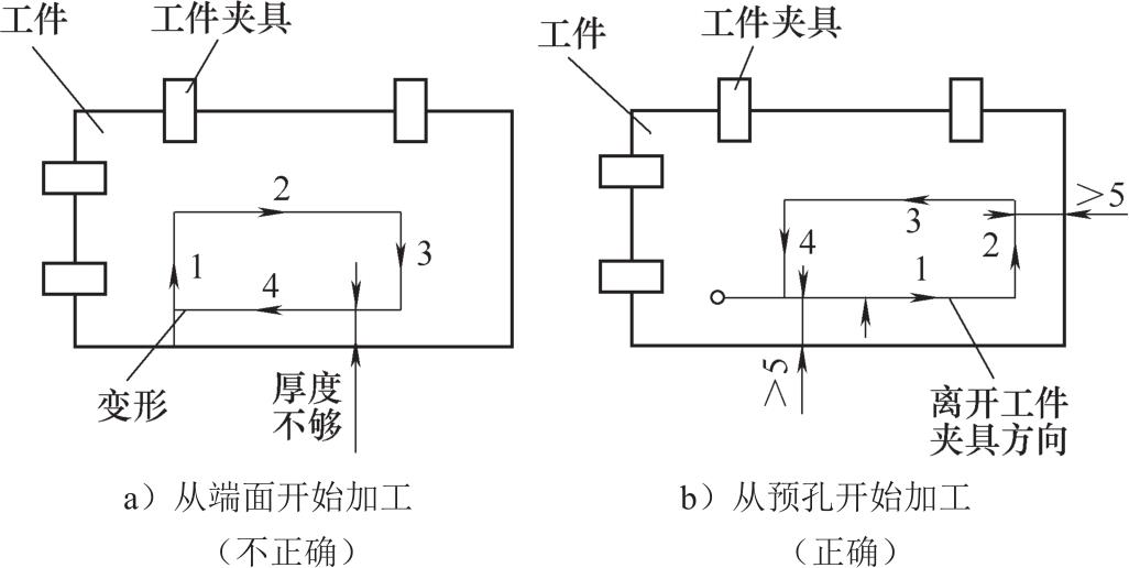 1)避免从工件端面开始加工,应从穿丝孔开始加工。