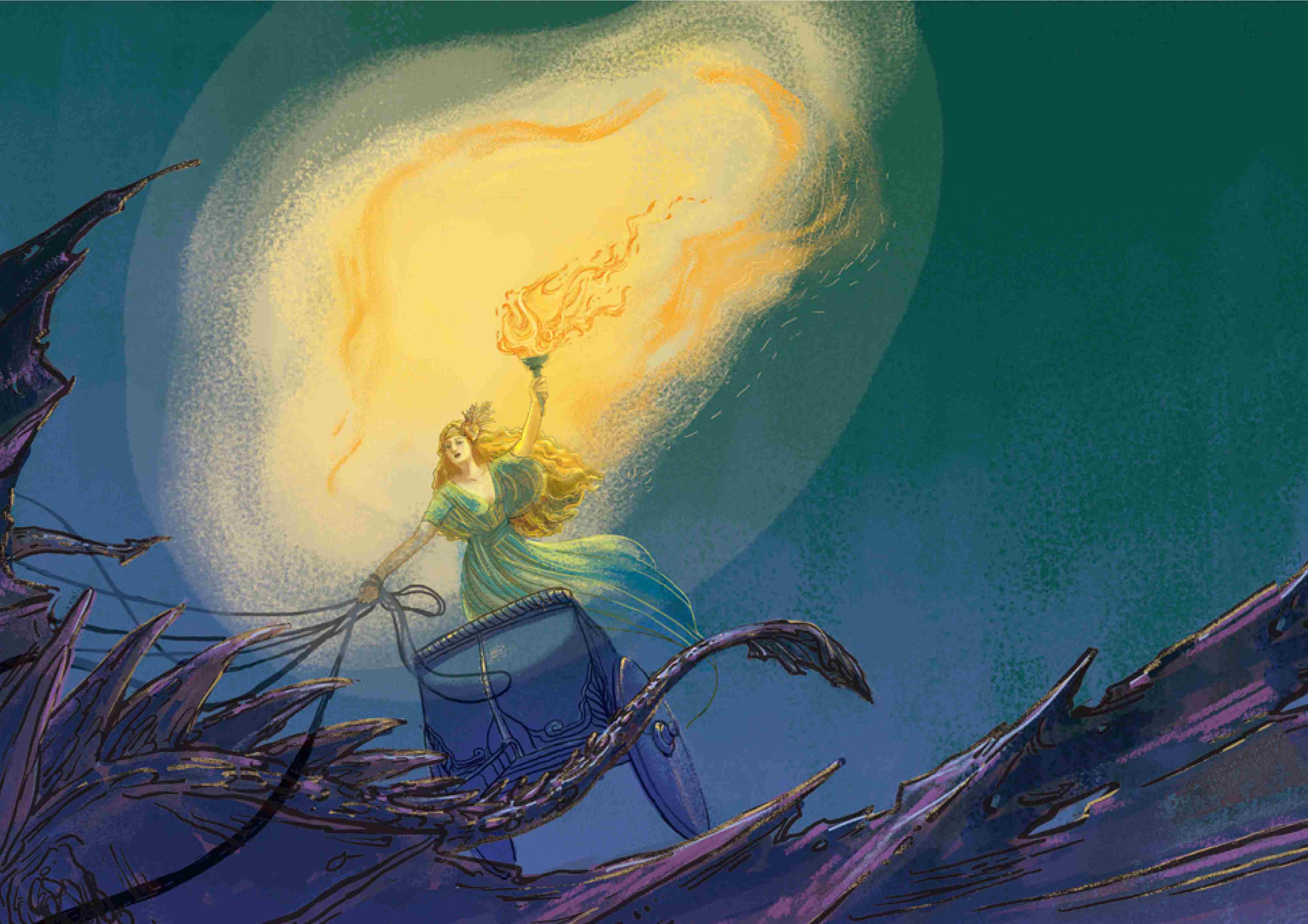 跟奥林匹斯山上的其他女神不太一样的是,农业和丰收女神得墨忒耳更喜欢在广袤的大地上漫游,帮助人们种植、收获谷物,选育、培养果树。当然,她在凡间的时候通常会采用各种各样的伪装,因为女神的装束实在是过于华美炫目了——她通常坐在两条巨龙拉着的战车里,身着绿色的长袍,而她卷曲的金色长发则随意地披在肩上。