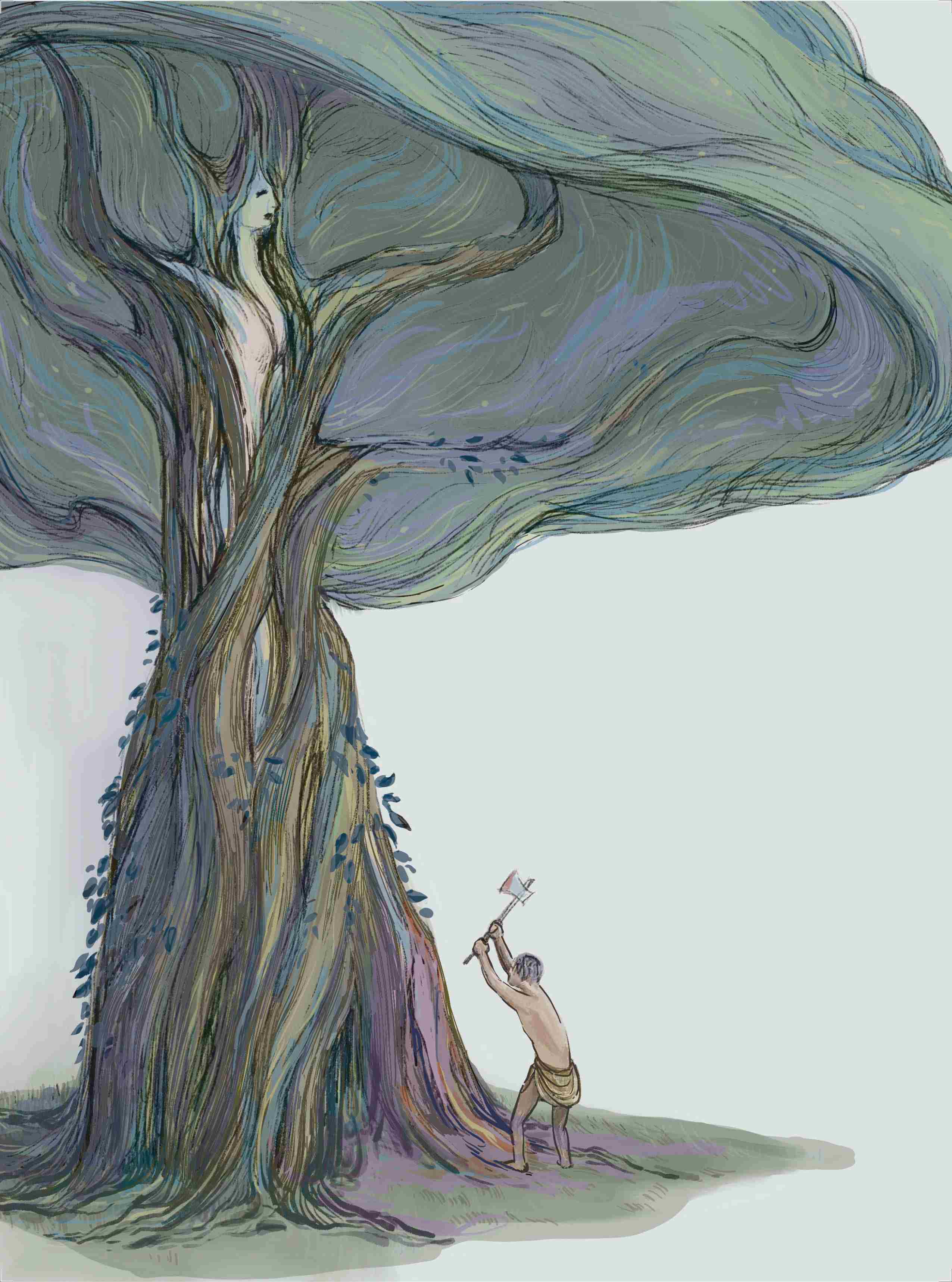 当他的斧子砍向树干的时候,鲜红的血液从树干中喷涌而出,就像砍到了一个人一样。一个声音清晰地说道:“我,不是别人,正是得墨忒耳女神最喜爱的橡树女仙,收起你的贪念,否则的话,女神会惩罚你的!”