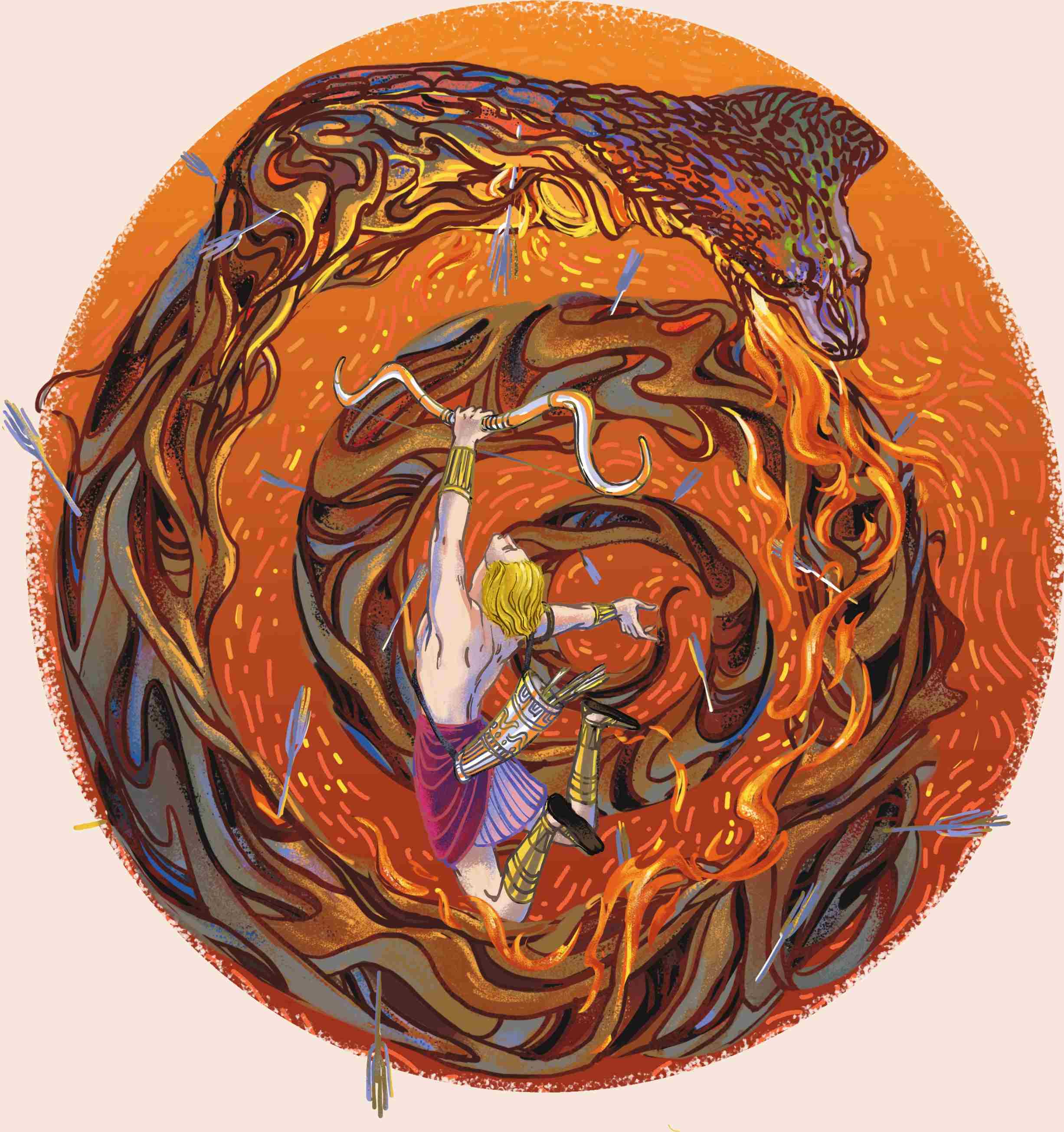 在美丽的提洛岛上,阿波罗和姐姐阿耳忒弥斯很快长大了。年轻的阿波罗像当年的宙斯一样健壮而俊美,和姐姐一样,他也爱好射箭,是个百发百中的神箭手。于是,他决定用自己手里的弓箭去挑战大蛇皮松(Python),为母亲勒托报仇。因为在勒托怀孕的时候,皮松曾经想吃掉她,但被她逃脱了。