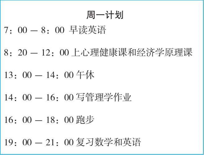 其次,要学会制订计划。你可以制订三种计划,主要任务计划、周计划和日计划。主要任务计划是将时间分配给常规活动,周计划是在主要任务计划的基础上加入更多细节,日计划是周计划的一种简易模式。