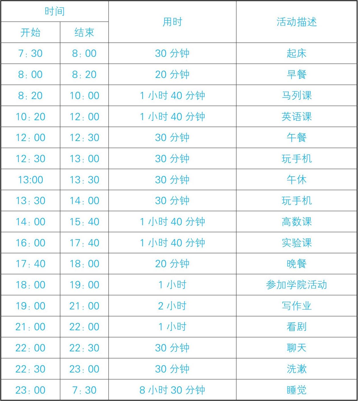 许多人总是说自己没有足够的时间去做想做的事情,但事实上,时间是公平的,只是没有意识到有些日常行为习惯如果有所改变就能够更好地利用时间。我们可以把每天从早上起床到晚上睡觉的时间里做的所有事情记录下来(如下表示例),就可以看到还存在哪些隐藏的时间。