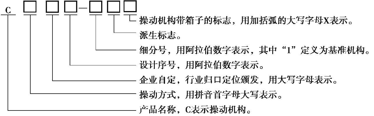 隔离开关的操动机构的基本构成包括操作能源系统、分闸与合闸控制系统、传动系统及辅助装置 4 个部分。操动机构的型号和含义如图 1.6 所示。