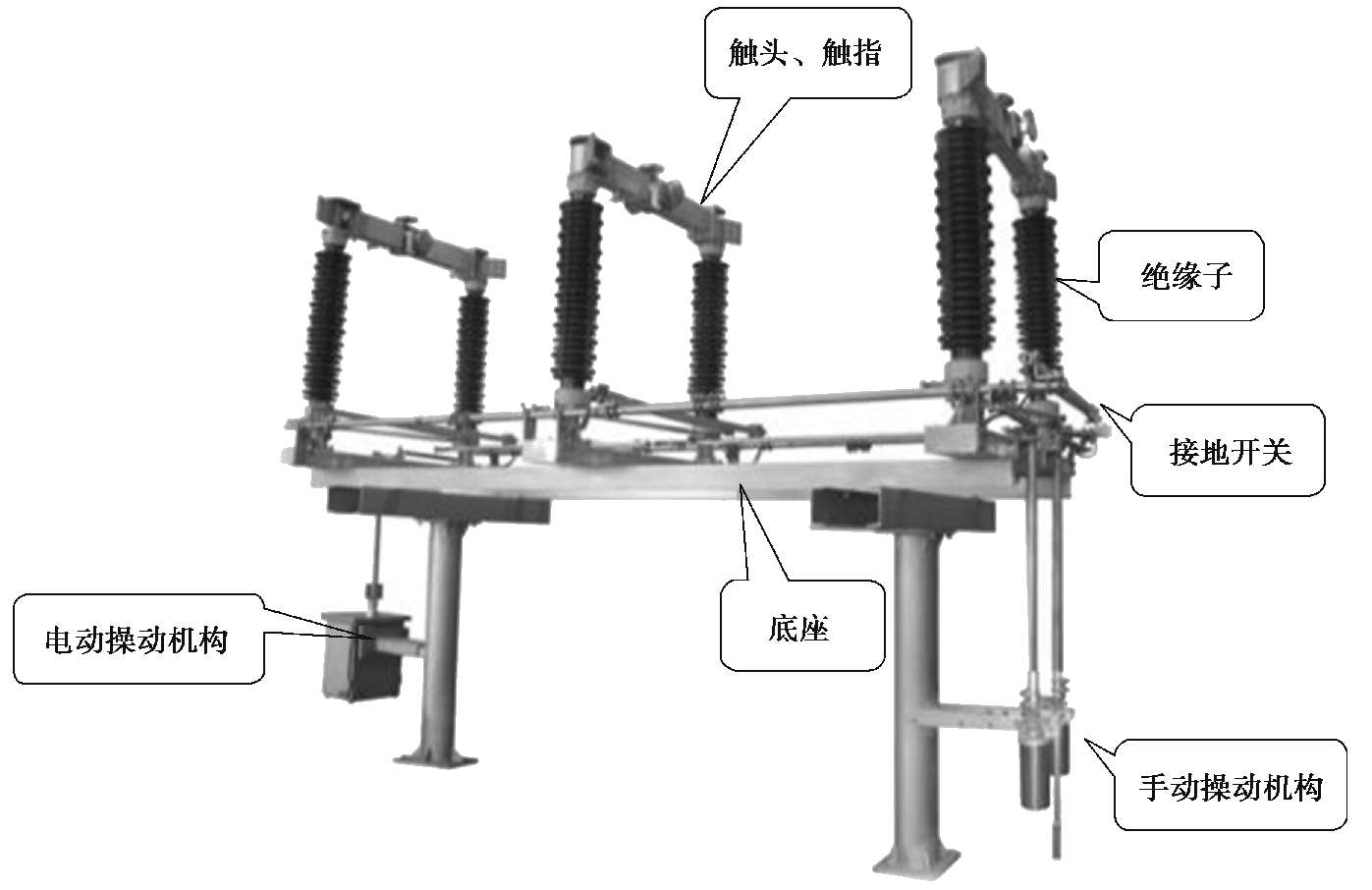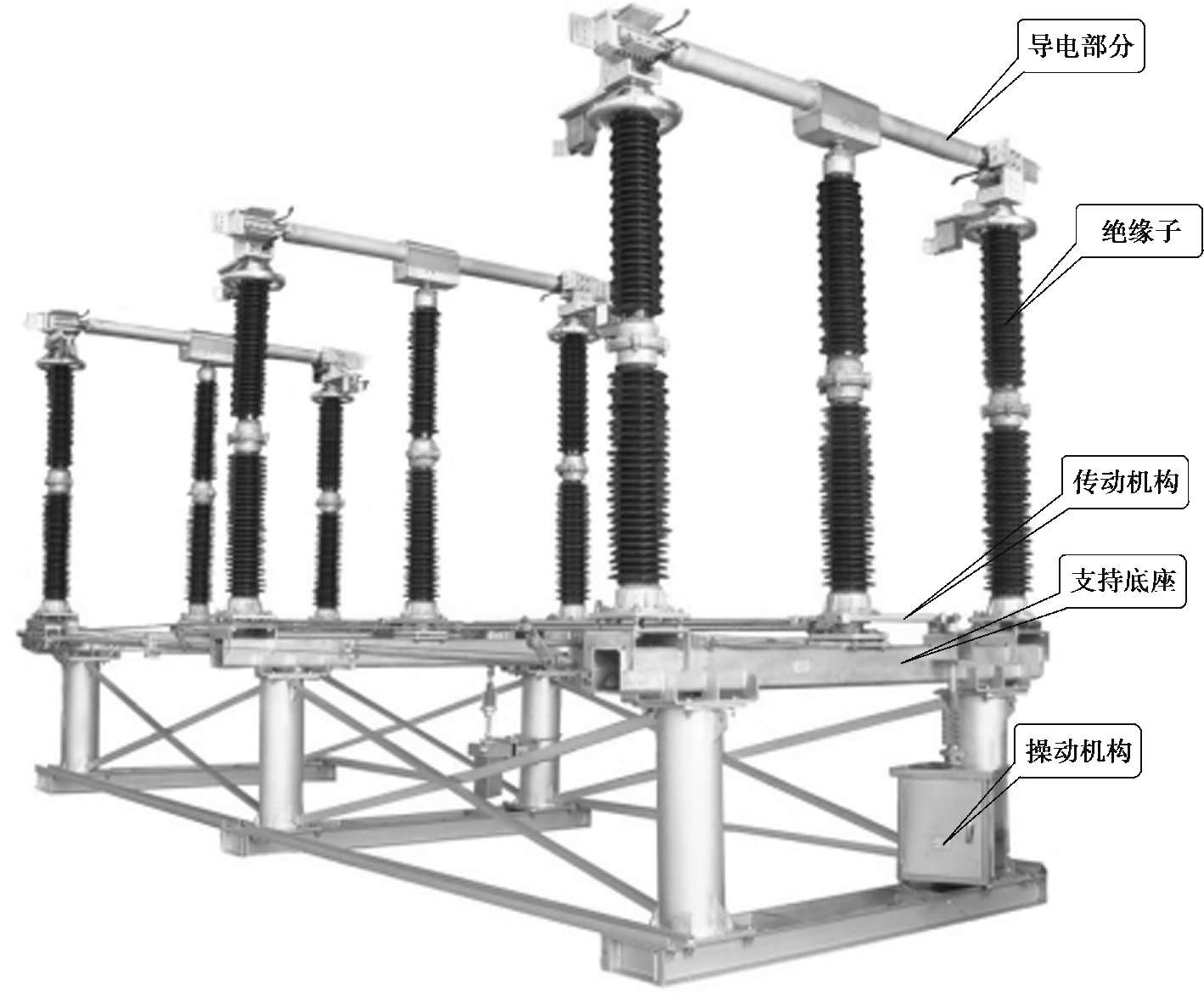 如图 1.5 所示,隔离开关的基本结构由导电部分、绝缘子、传动机构、支持底座和操动机构组成。