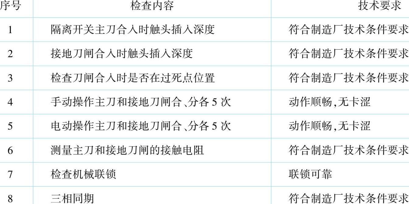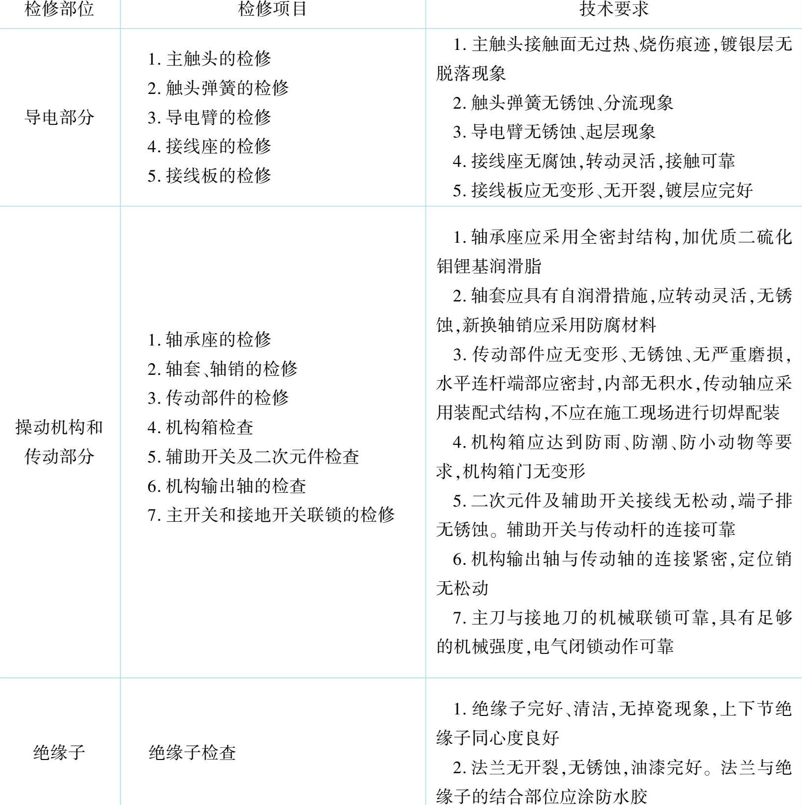 ③绝缘子检查。隔离开关的大修项目与技术要求见表 1.2。隔离开关大修后应按表1.3的项目和技术要求进行调整及试验工作。