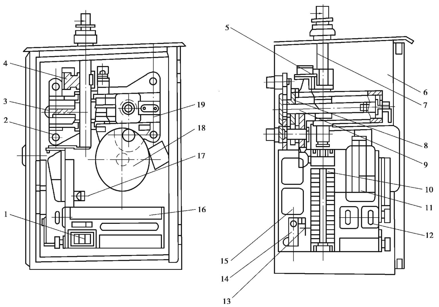 图 1.7 CJ6 电动操作机构内部结构图1—按钮;2—框架;3———蜗轮;4—定位件;5—行程开关;6—箱;7—主轴;8—齿轮;9—蜗杆;10—辅助开关;11—刀开关;12—组合开关;13—加热器;14—热继电器;15—接触器;16—接线端子;17—照明灯座;18—电动机;19—手动闭锁开关