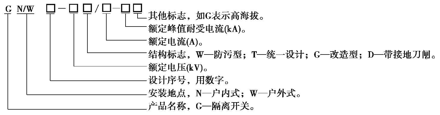 如GW4-126D/ 1250-40各部分含义为:G表示隔离开关,W表示户外,4为设计序号,额定电压为 126 kV,D表示有接地隔离开关,额定电流为 1250 A,额定峰值耐受电流(热稳定电流)为 40 kA。