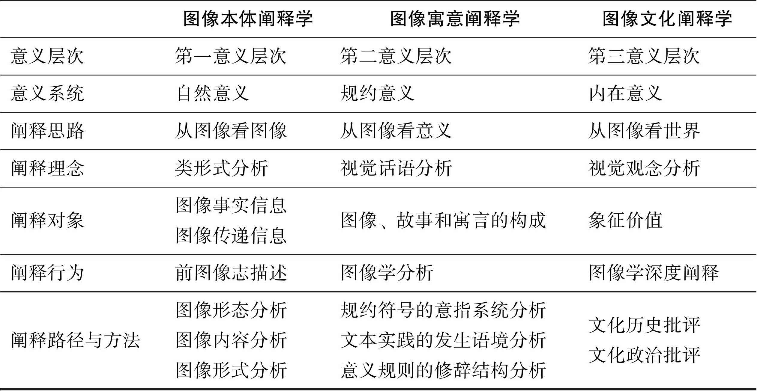 图像本体阐释学图像寓意阐释学图像文化阐释学意义层次第一意义层次第二意义层次第三意义层次意义系统自然意义规约意义内在意义阐释思路从图像看图像从图像看意义从图像看世界阐释理念类形式分析视觉话语分析视觉观念分析阐释对象图像事实信息图像传递信息图像、故事和寓言的构成象征价值阐释行为前图像志描述图像学分析图像学深度阐释阐释路径与方法图像形态分析图像内容分析图像形式分析规约符号的意指系统分析文本实践的发生语境分析意义规则的修辞结构分析文化历史批评文化政治批评概括而言,图像学视域下的视觉释义体系主要包含三个层次,即图像本体阐释学、图像寓意阐释学、图像文化阐释学,三者分别关注的意义系统是自然意义、规约意义、内在意义,其阐释思路分别体现为“从图像看图像”“从图像看意义”“从图像看世界”,阐释理念分别为类形式分析、视觉话语分析、视觉观念分析。进一步讲,图像本体阐释学的阐释对象是图像事实信息和图像传递信息,阐释行为表现为前图像志描述,阐释路径与方法主要有三:一是图像形态分析,二是图像内容分析,三是图像形式分析;图像寓意阐释学的阐释对象是图像、故事和寓言的构成,阐释行为表现为图像学分析,阐释路径与方法同样有三:一是规约符号的意指系统分析,二是文本实践的发生语境分析,三是意义规则的修辞结构分析;图像文化阐释学的阐释对象是图像所反映的象征价值,阐释行为表现为图像学深度阐释,即广义的图像学阐释,阐释路径与方法主要表现为图像维度上的文化历史批评和文化政治批评。
