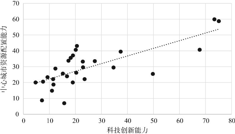 图3-10 都市圈中心城市资源配置能力与科技创新能力散点图
