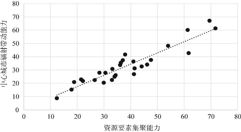 图3-4 都市圈中心城市辐射带动能力与资源要素集聚能力散点图