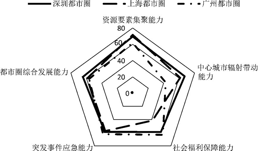 图3-2 深圳、上海和广州都市圈综合发展能力与分项得分示意