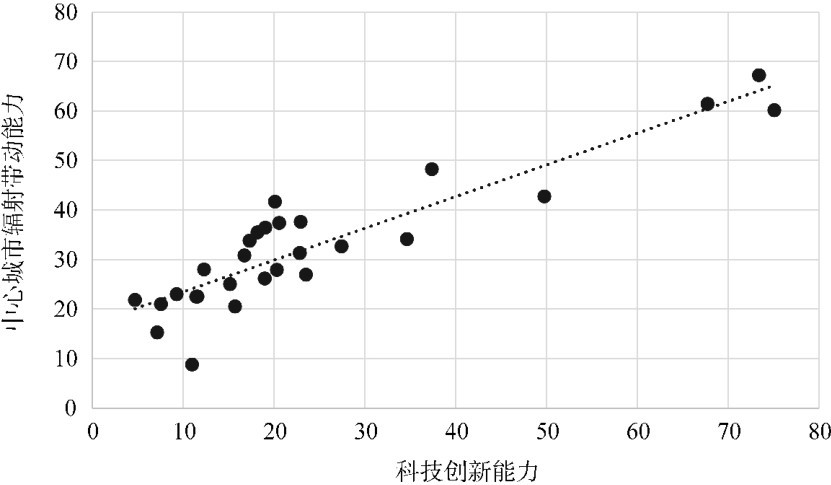 图3-9 都市圈中心城市辐射带动能力与科技创新能力散点图