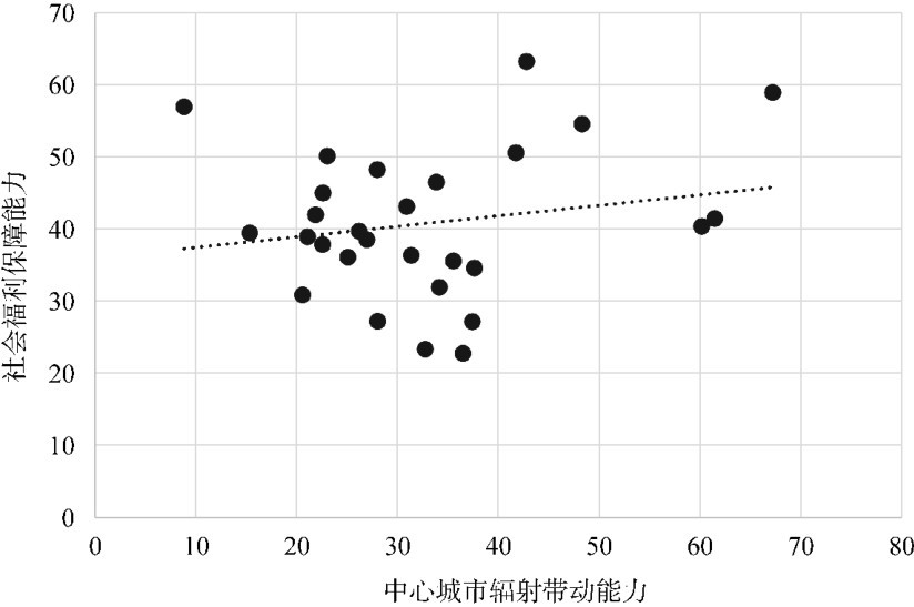 图3-5 都市圈社会福利保障能力与中心城市辐射带动能力散点图