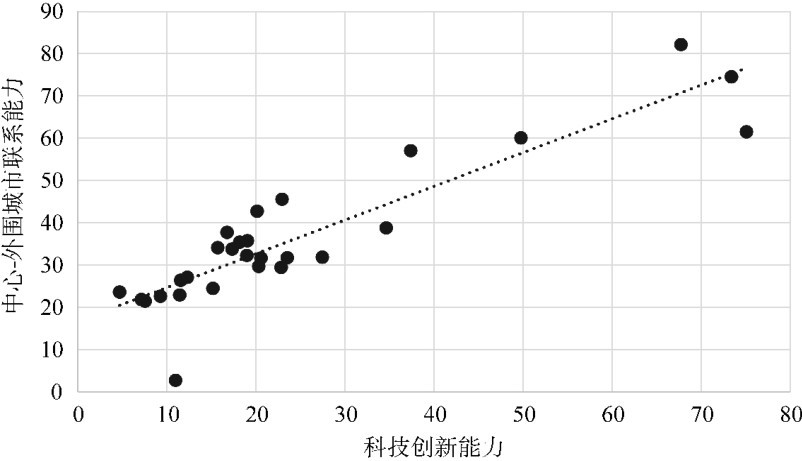 图3-11 都市圈中心-外围城市联系能力与科技创新能力散点图