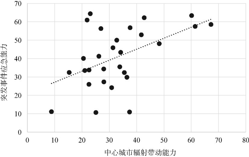 图3-6 都市圈突发事件应急能力与中心城市辐射带动能力散点图