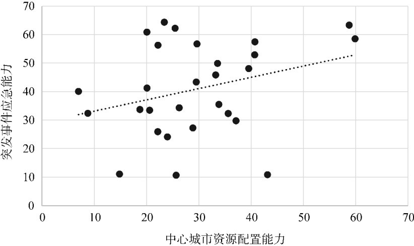 图3-7 都市圈突发事件应急能力与中心城市资源配置能力散点图