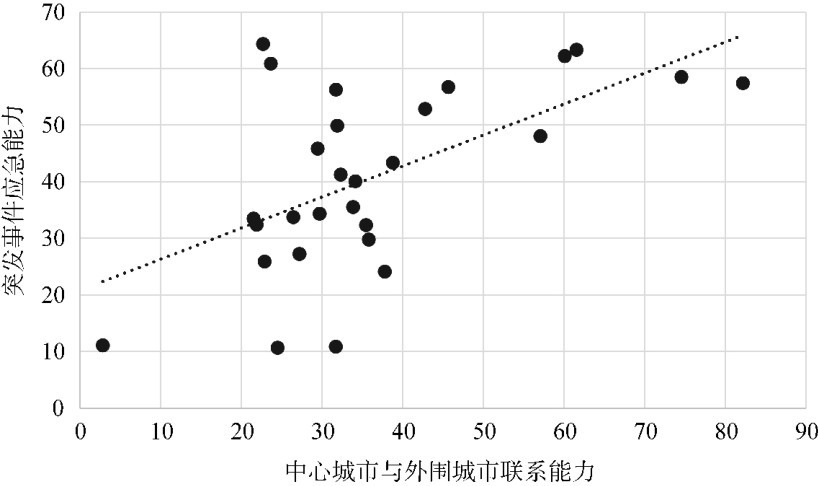 图3-8 都市圈突发事件应急能力与中心-外围城市联系能力散点图