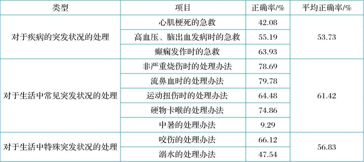 我们将1~10题分为“对于疾病的突发状况的处理”“对于生活中常见突发状况的处理”“对于生活中特殊突发状况的处理”三类。经过统计,我们发现每一类问题的平均正确率在50%~60%,考虑到问题全部为单选题,这样的结果并不算理想。“对于疾病的突发状况的处理”一类平均正确率相对较低,为53.73%;“对于生活中常见突发状况的处理”一类平均正确率相对较高,为61.42%。
