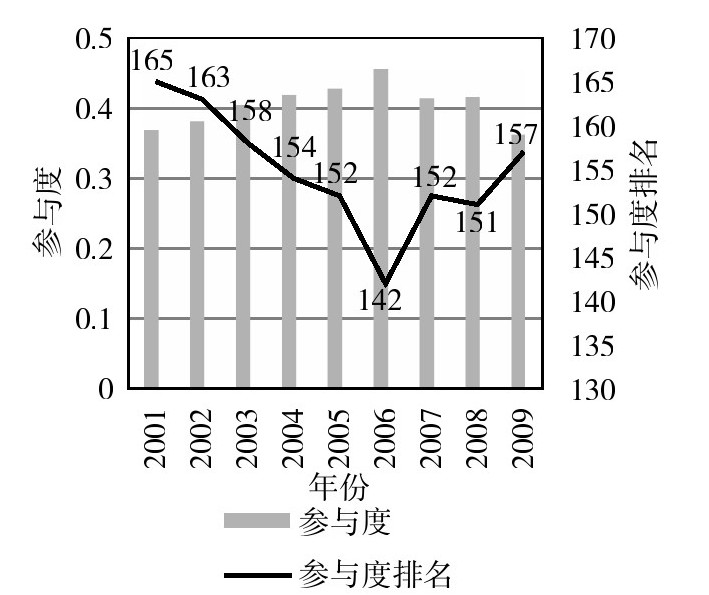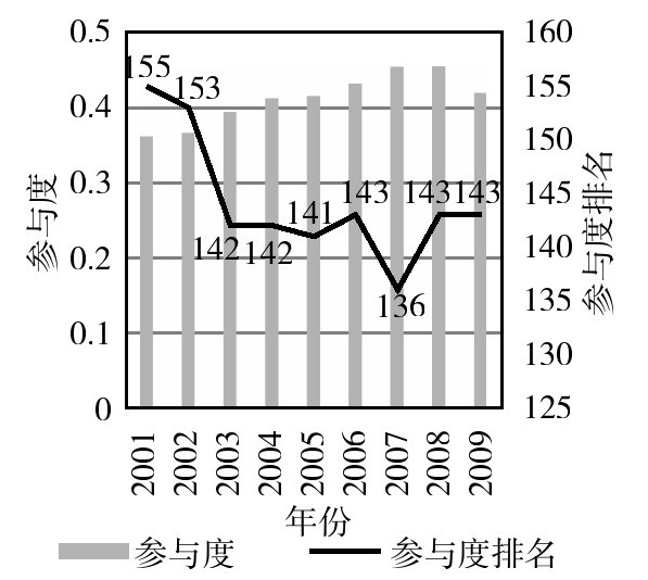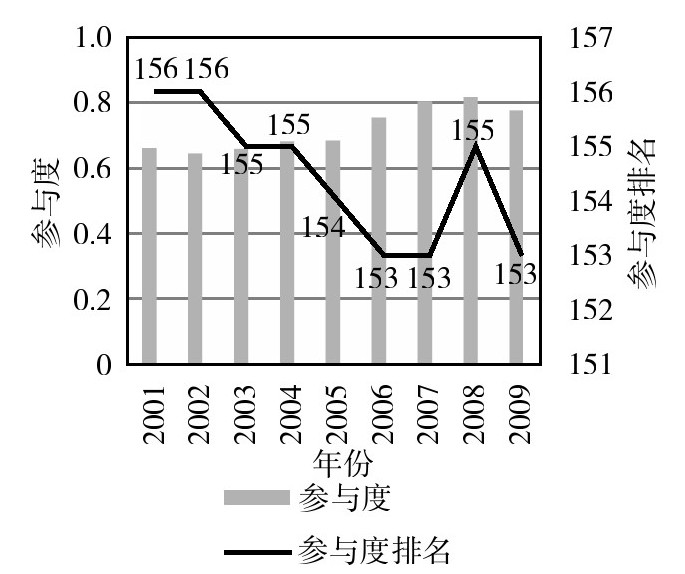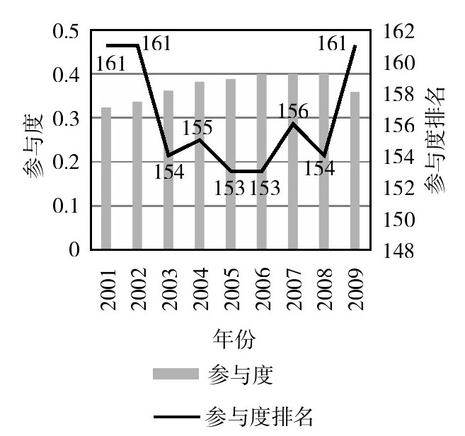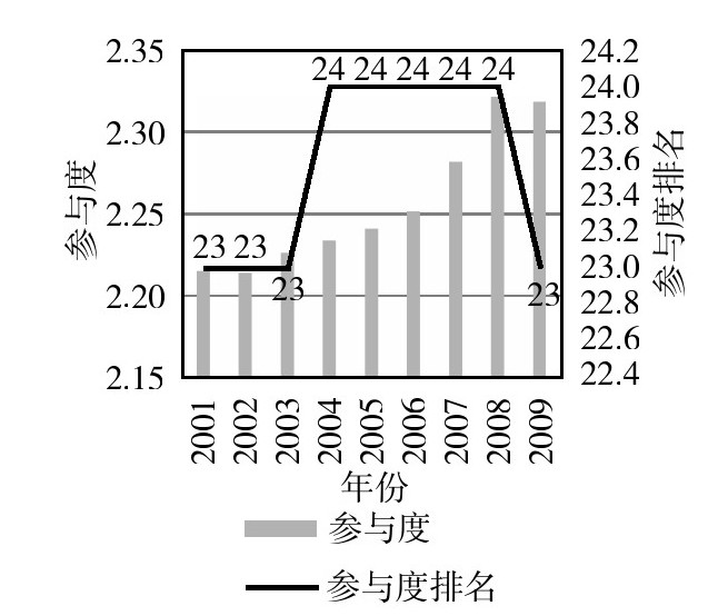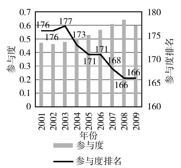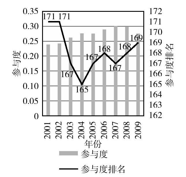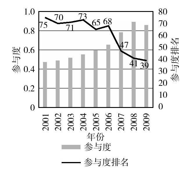 图3.30 2001—2009年中国建筑业参与度及排名变动