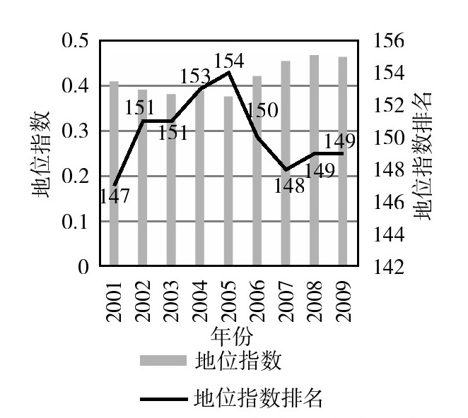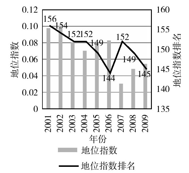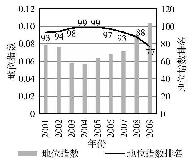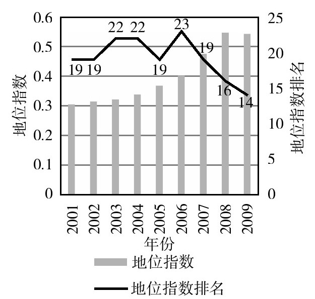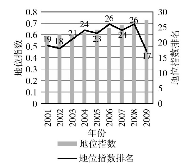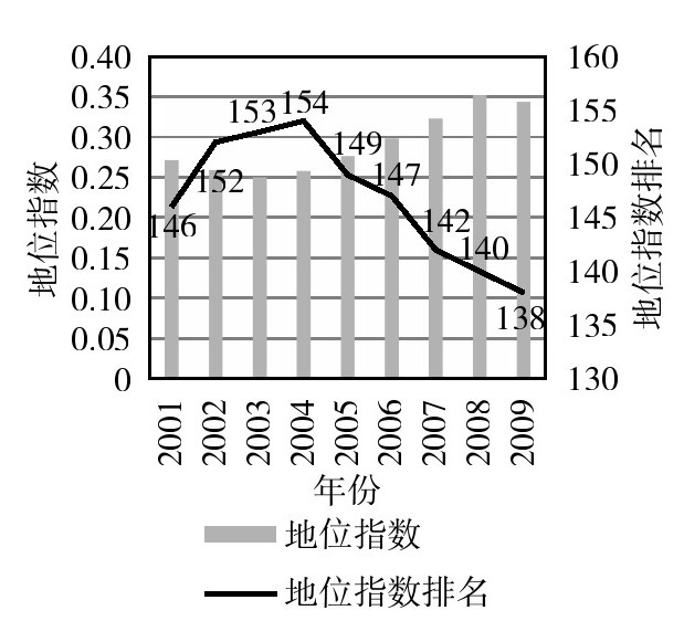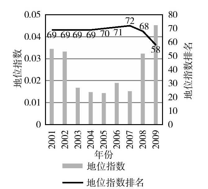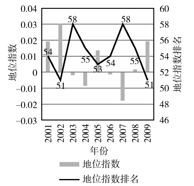 图3.29 2001—2009年中国建筑业地位指数及排名变动