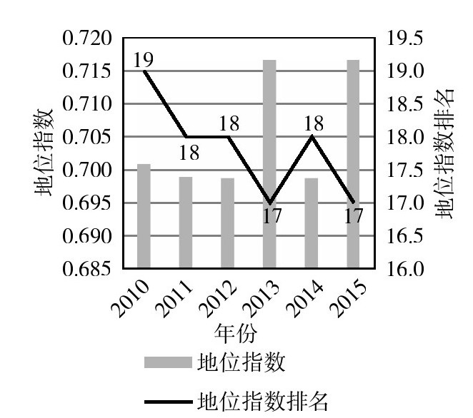 图3.41 2010—2015年中国第三产业地位指数及排名变动