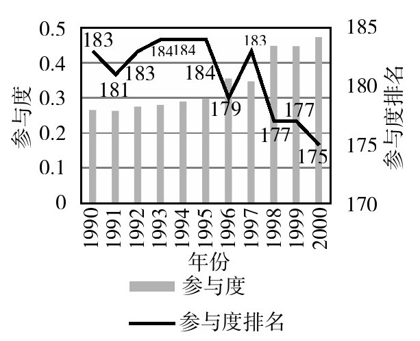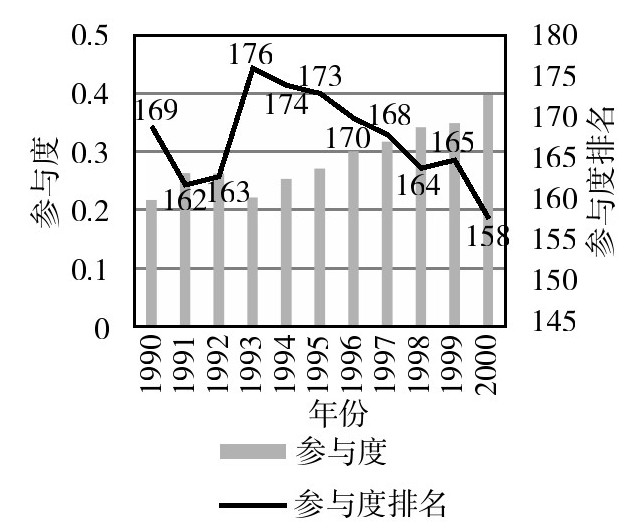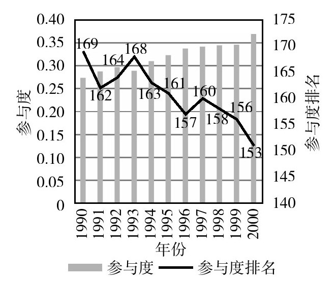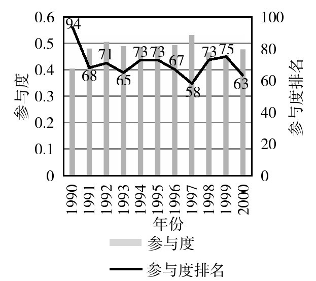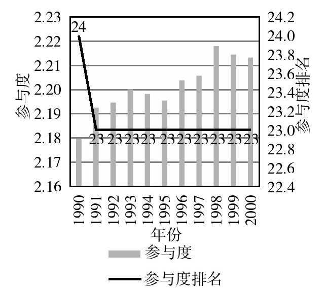 图3.10 1990—2000年中国第三产业参与度及排名变动