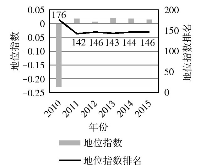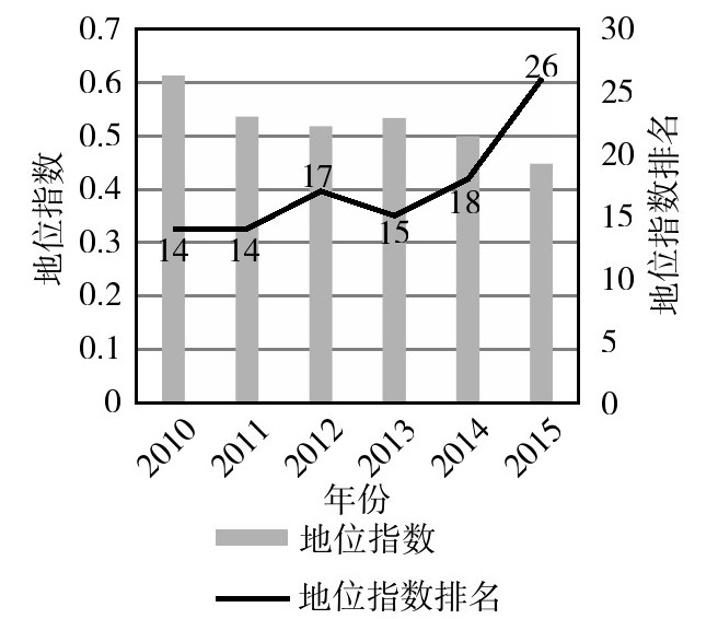 图3.35 2010—2015年中国第一产业地位指数及排名变动