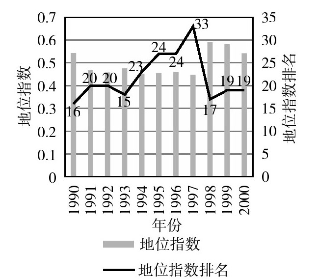 图3.9 1990—2000年中国第三产业地位指数及排名变动