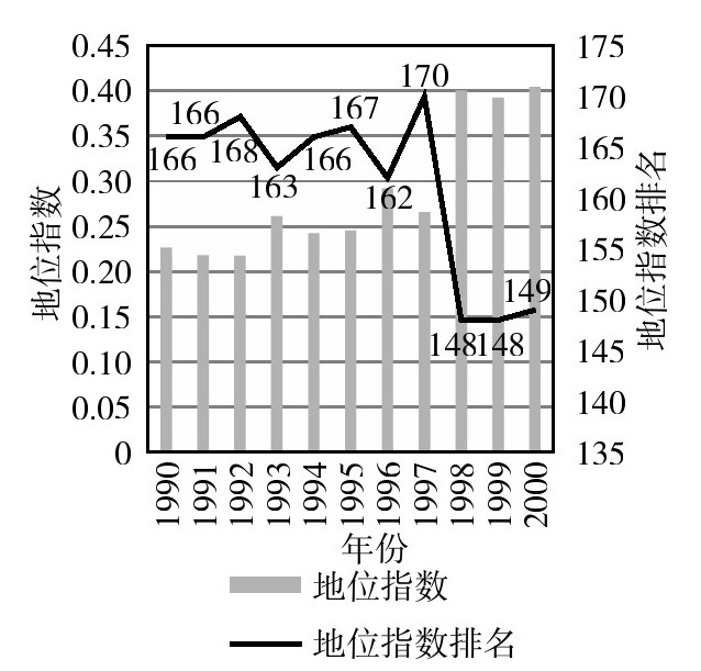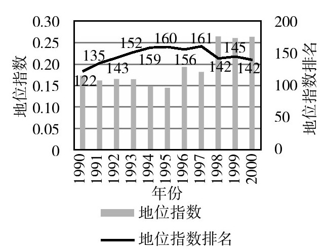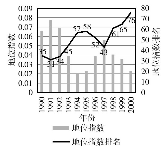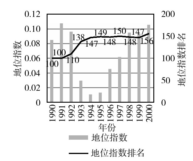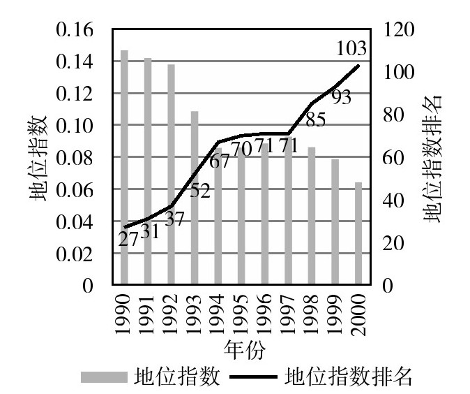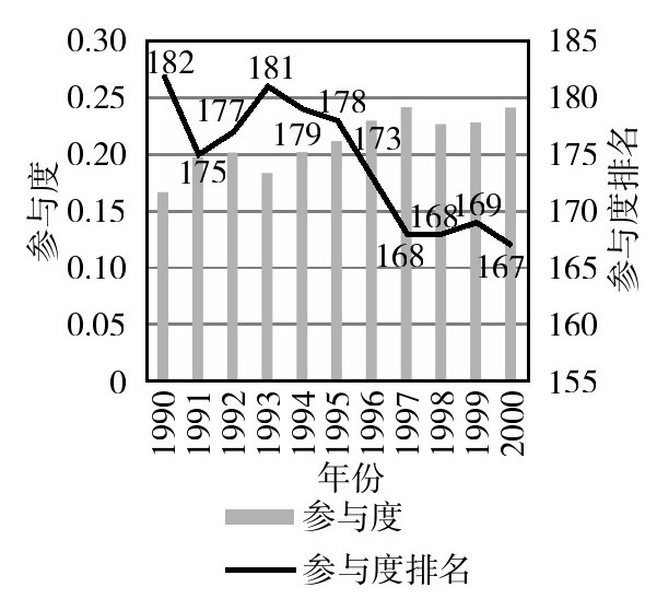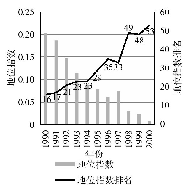 从总体角度进行分析(见图3.1和图3.2),1990年,中国地位指数排第27位,处于较高水平,1990—2000年,中国地位指数绝对值及相对排名均呈下降趋势,表明中国正从出口绝对主导的粗放型发展模式逐渐转为出口、进口并重的全贸易链综合型发展模式;1990年,中国参与度排第169位,处于较低水平,1990-2000年参与度绝对值及相对排名均呈上升趋势,表明中国在GVC中的融入程度日趋增强。