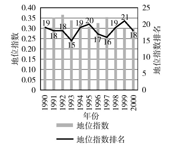 图3.13 1990—2000年中国建筑业地位指数及排名变动