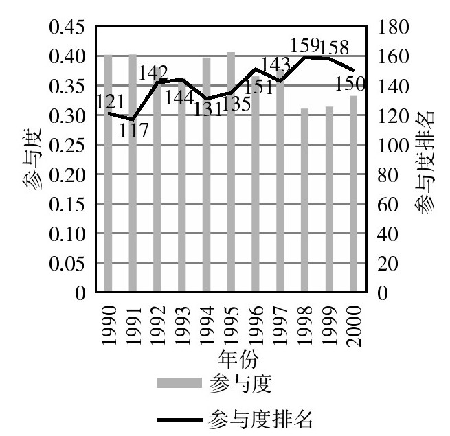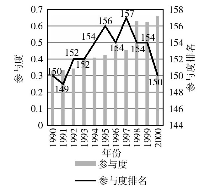 图3.14 1990—2000年中国建筑业参与度及排名变动