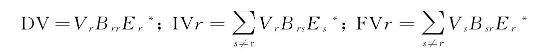 根据贸易附加值矩阵,我们可以引入三个指标DV、FV、IV,DV r 表示经济体r总出口中属于该经济体的价值贡献量总和,FV r 表示经济体r总出口中属于其他经济体的价值贡献量总和,IV r 表示其他经济体出口中属于经济体r的价值贡献量总和,具体计算公式为: