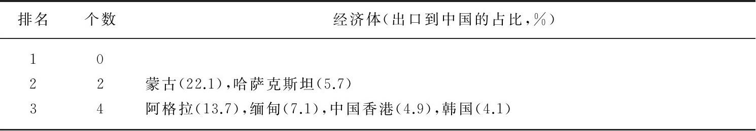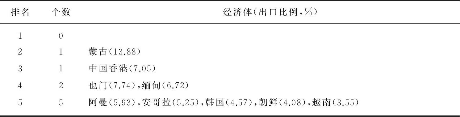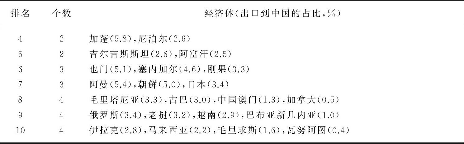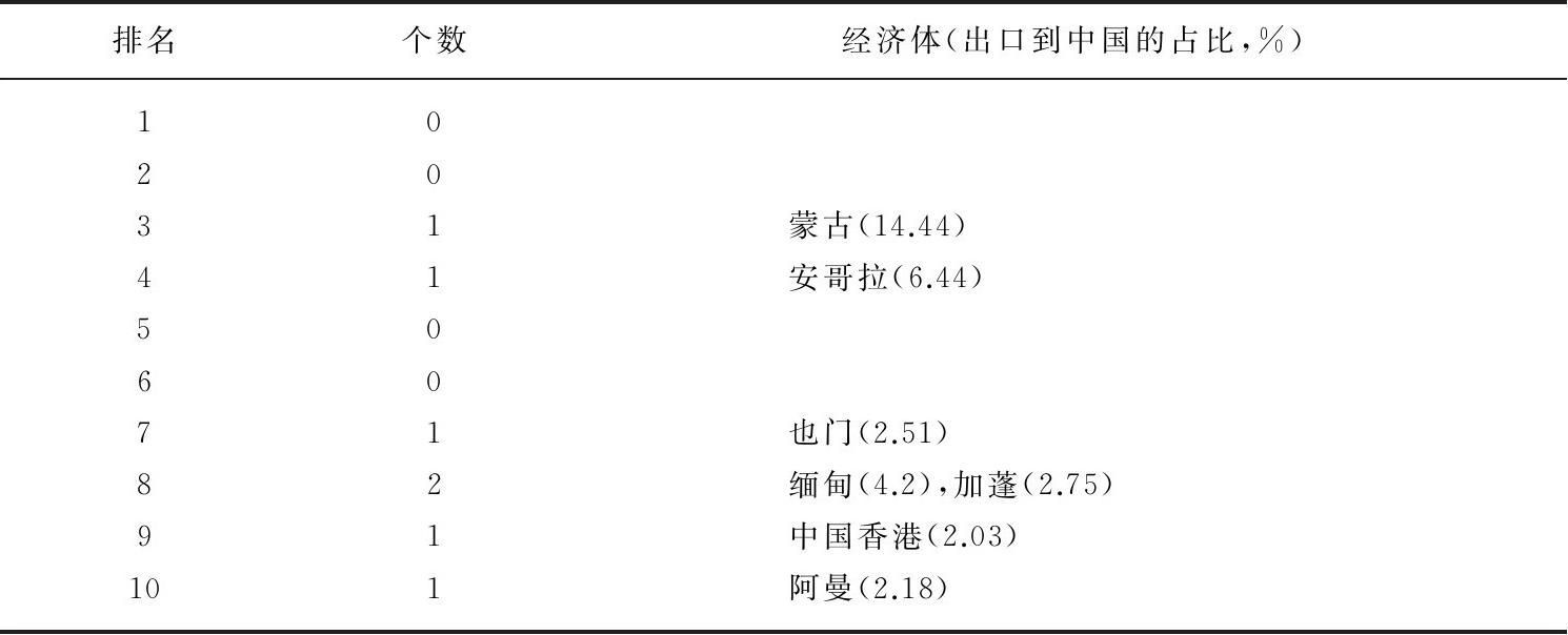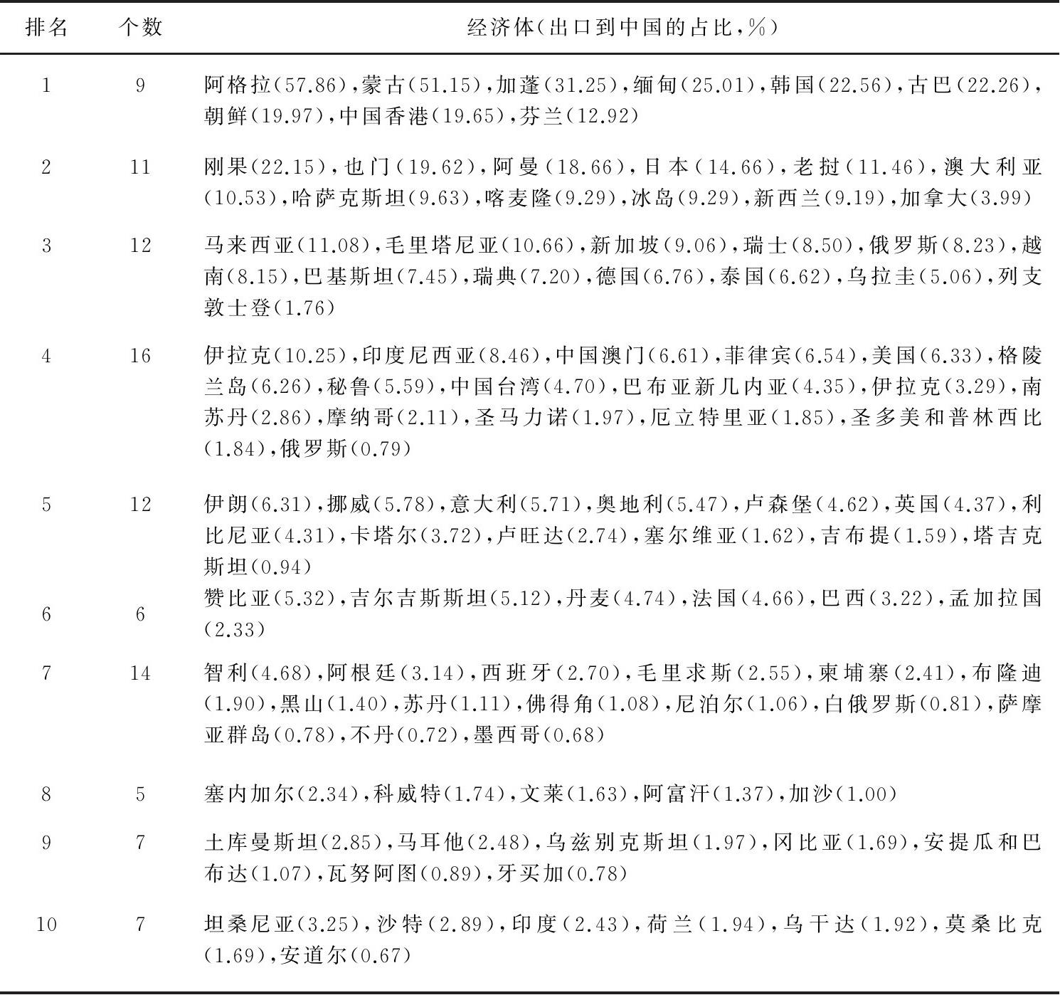 表1.1至表1.3列示了向中国出口最终消费品的比例在该经济体所有出口目的地中排名前十的情况。从表1.1可知,中国在各经济体最终消费品出口结构中排名第三、四、七、九、十的经济体数量分别有1个,排名第八的经济体数量有2个,合计有7个,占186个样本经济体的比例很小。中国不是全球各经济体最终消费品出口的主要对手方。