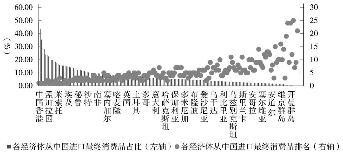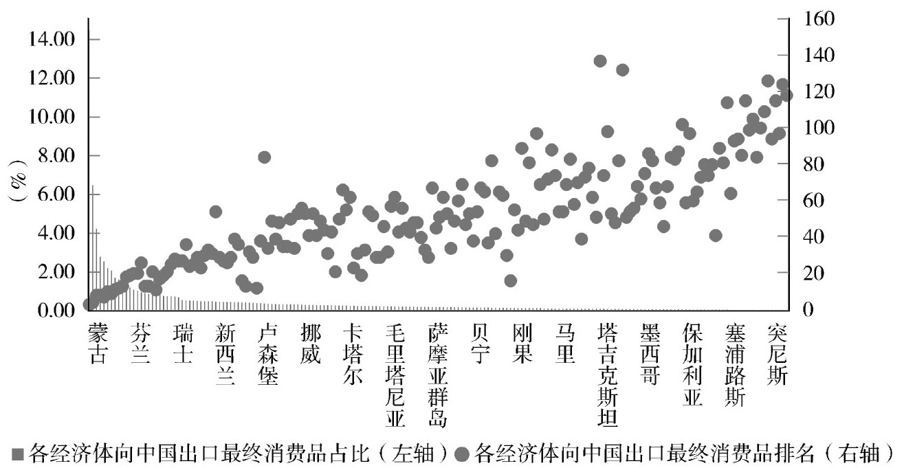 2013年,中国在最终消费品出口目的地中排名第一位的经济体数量增至9个,包括韩国、中国香港、芬兰等,排名第二至第五位的经济体包括日本、澳大利亚、加拿大、俄罗斯、美国等,排名前五位的经济体数量增加至60个,排名前十的经济体共99个,占样本经济体数量的52.7%。