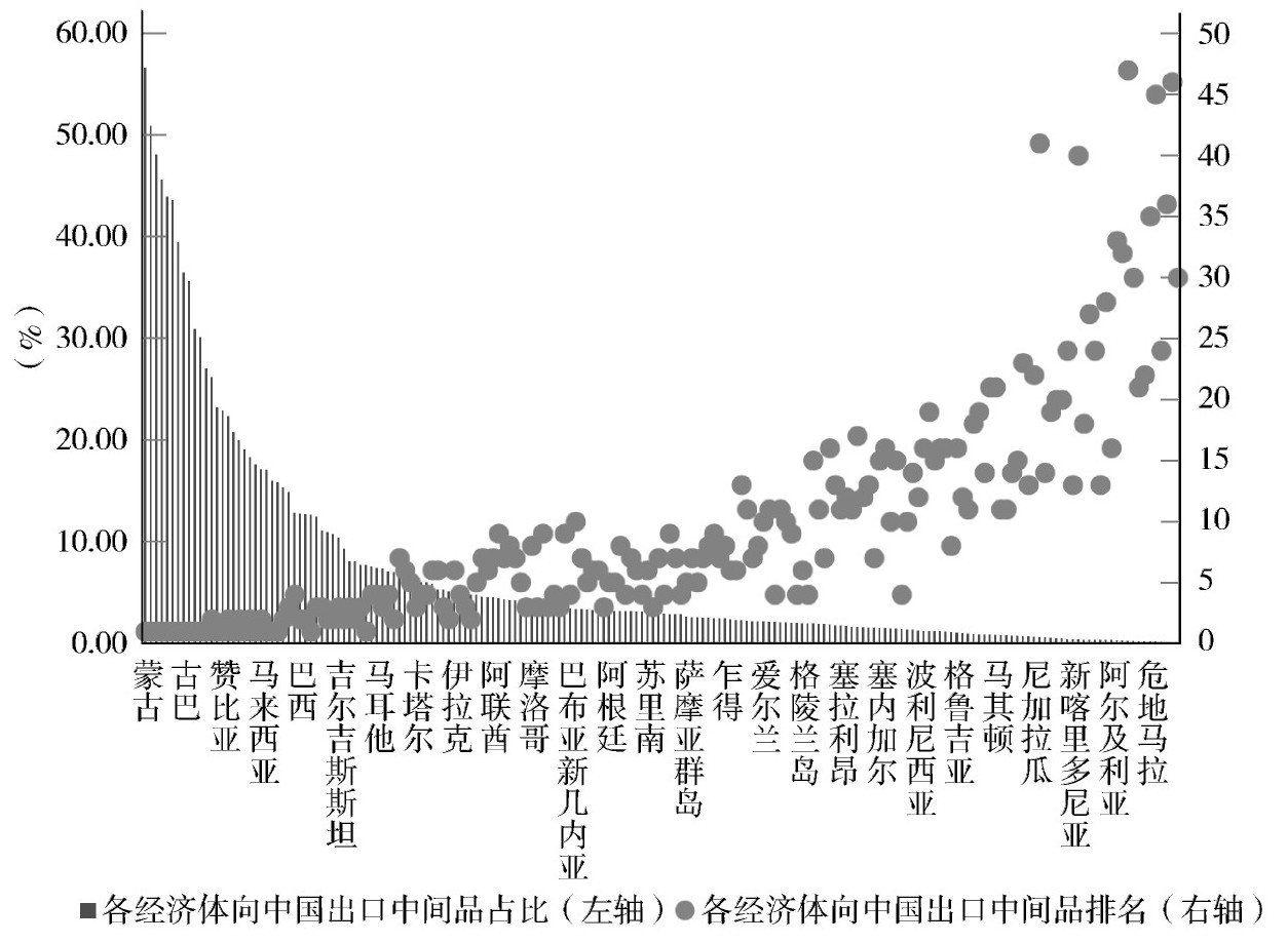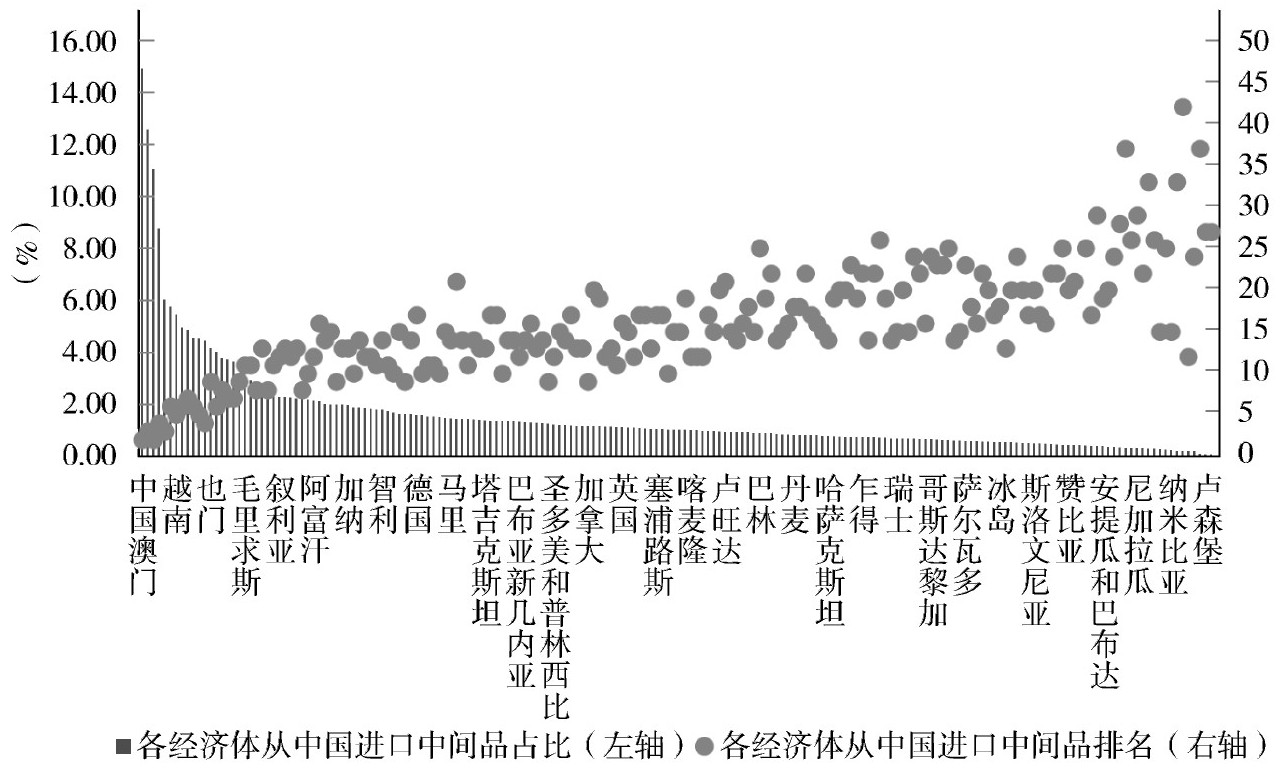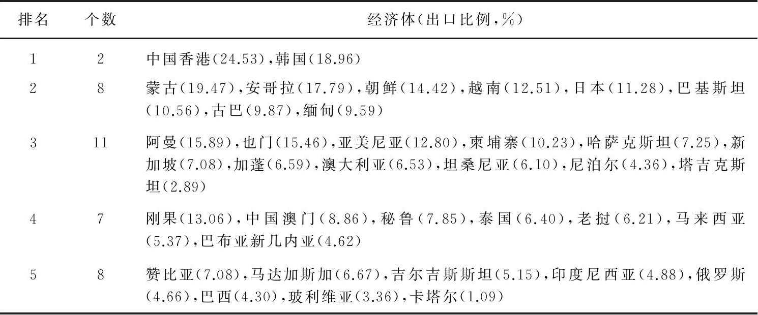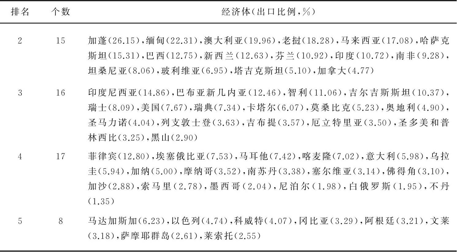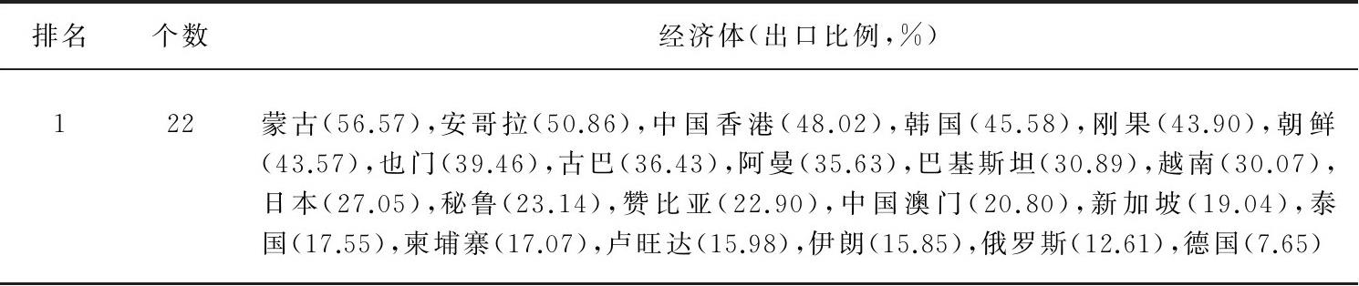 2013年,出口到中国的中间品比例在该经济体所有出口目的地中排名第一的经济体数量达到22个,各大洲分布广泛,体现出以近邻为主、以发展中经济体为主的特点。排名第二至第五的经济体数量分别为15、16、17、8个,排名前五的经济体数量总计78个,占186个样本经济体数量的41.49%。