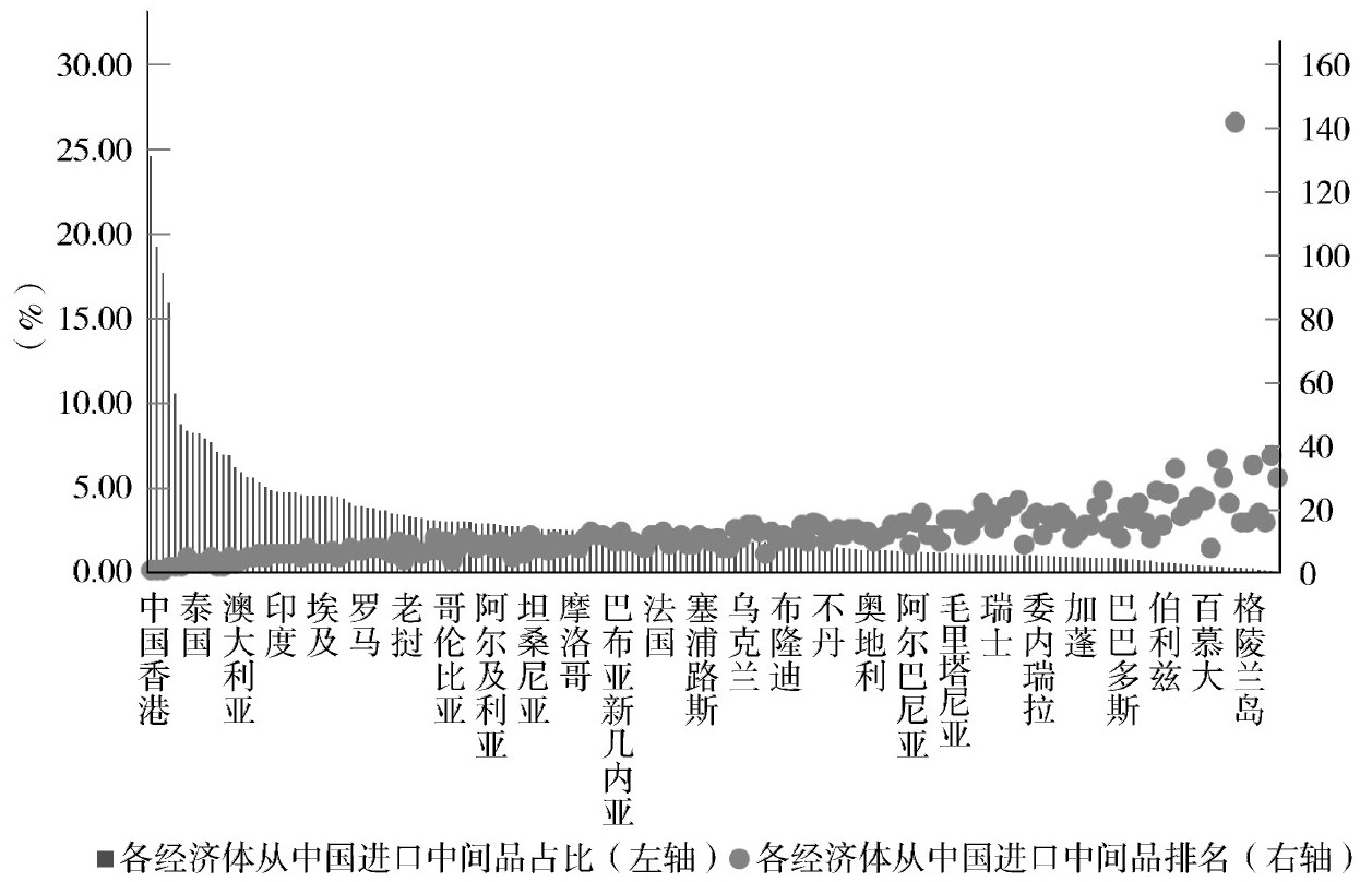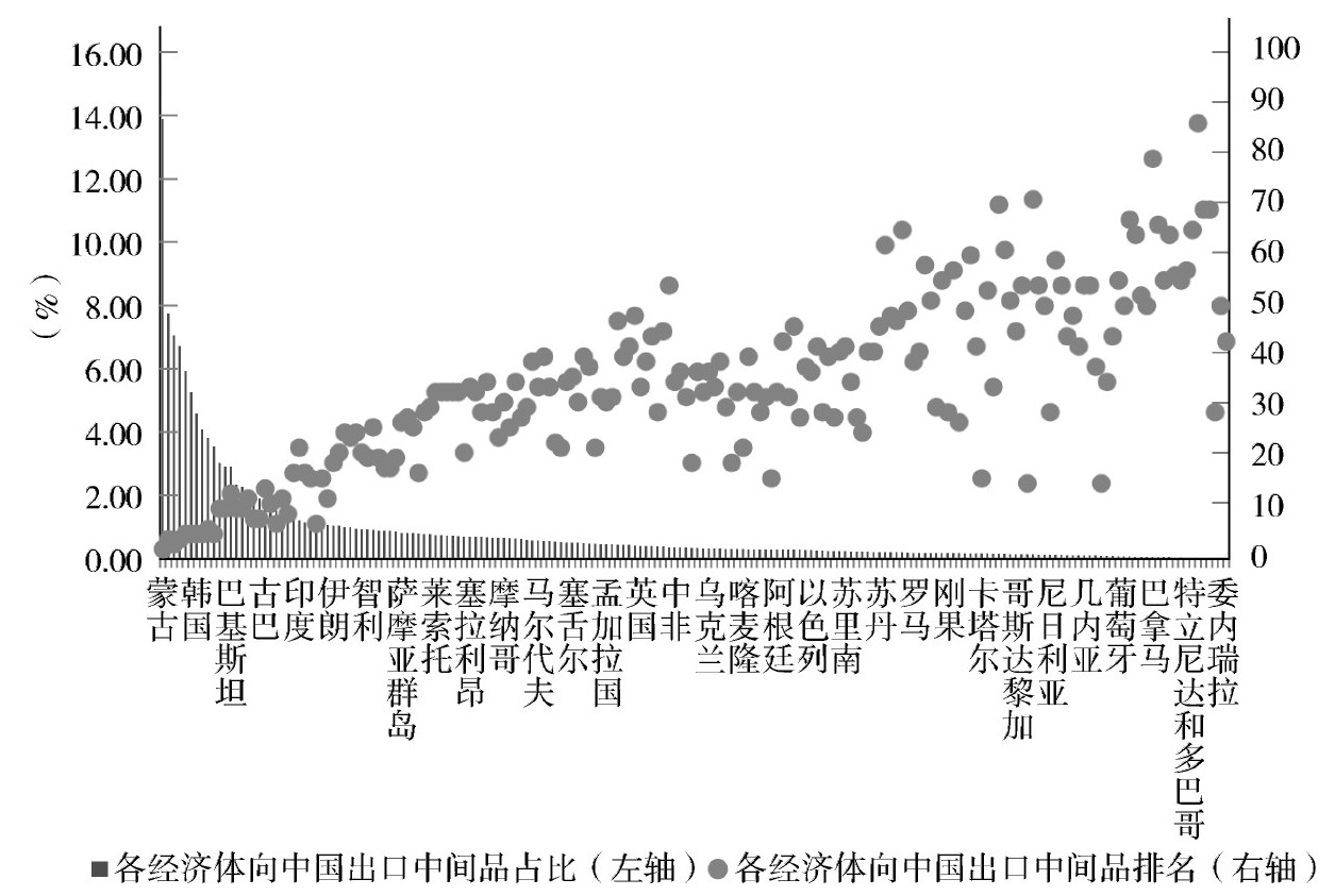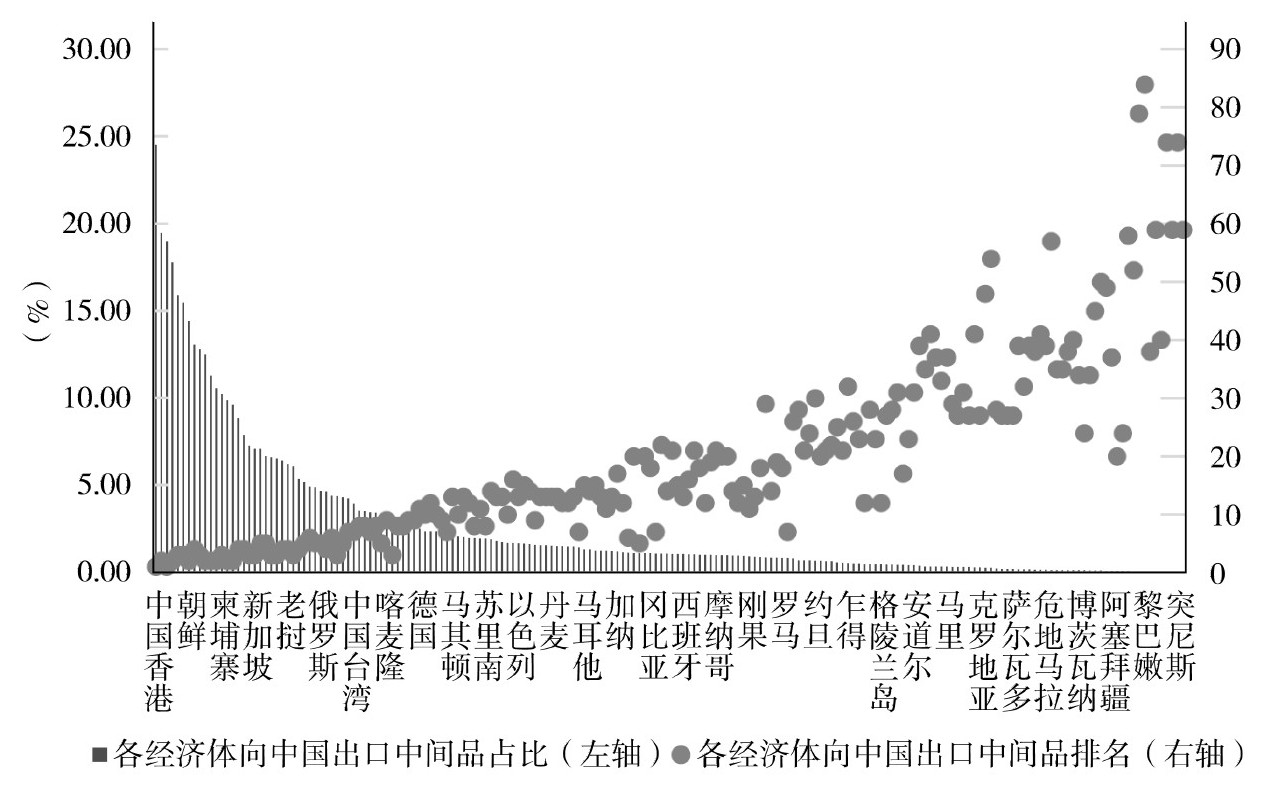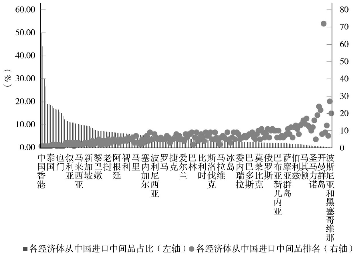2013年,出口到中国的中间品比例在该经济体所有出口目的地中排名第一的经济体数量达到22个,各大洲分布广泛,体现出以近邻为主、以发展中经济体为主的特点。排名第二至第五的经济体数量分别为15、16、17、8个,排名前五的经济体数量总计78个,占186个样本经济体数量的41.49%。