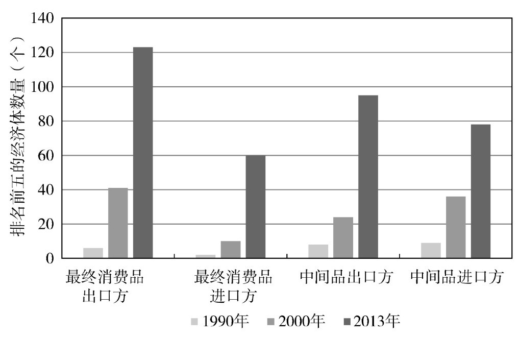 通过三个时间节点的对比分析可知,截至2013年,排名前五位的经济体数量增加至60个,为1990年的30倍,23年内年均复合增长率达到15.9%;排名前十位的经济体数量增至99个,为1990年的14.1倍,23年内年均复合增长率达到12.2%。1990—2013年中国作为重要最终消费品出口目的地的地位不断巩固,中国作为最终消费品的贸易进口方越来越在世界各经济体的贸易体系中占据重要地位。