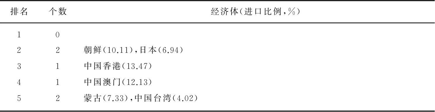 2000年,自中国进口中间品的样本经济体比例在该经济体所有进口来源地中排名第一的样本经济体数量提升到3个(中国香港、中国澳门、朝鲜),排名第二至第五的经济体数量分别为5、4、3、9个,前五位合计数量24个,为1990年的3倍。