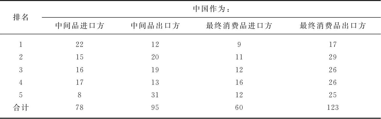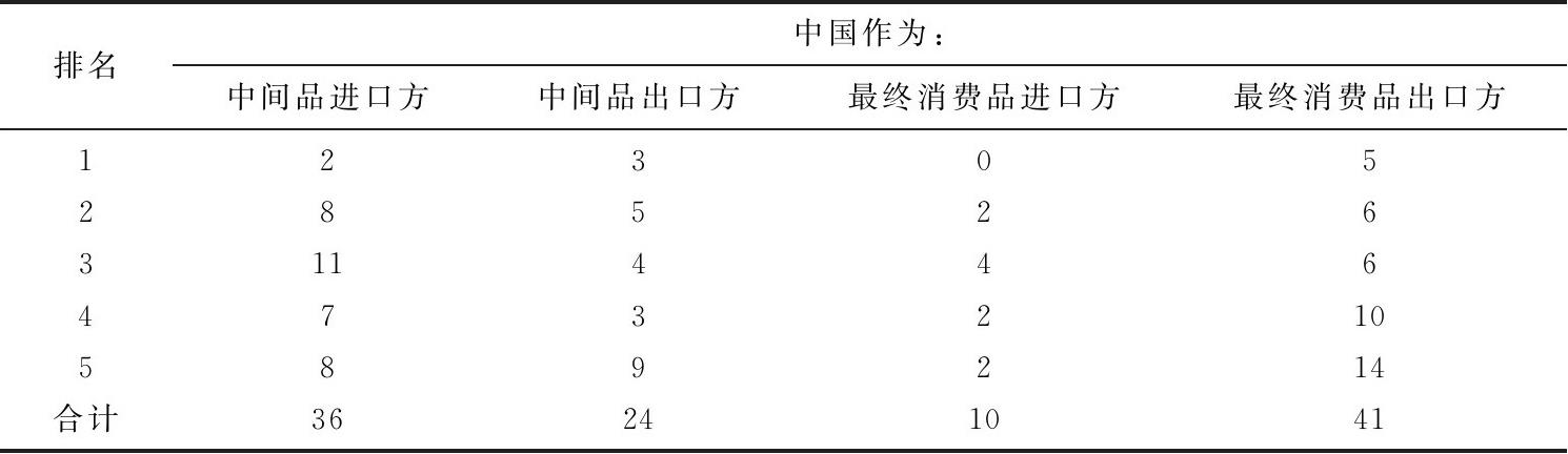 表1.12 2013年中国在该经济体中间品进口来源地中占据前五位的情况(中国作为出口方)