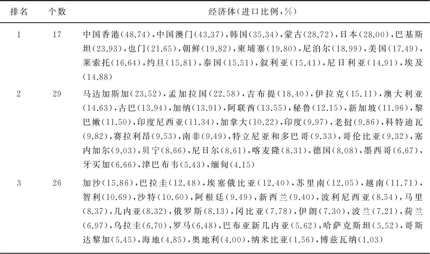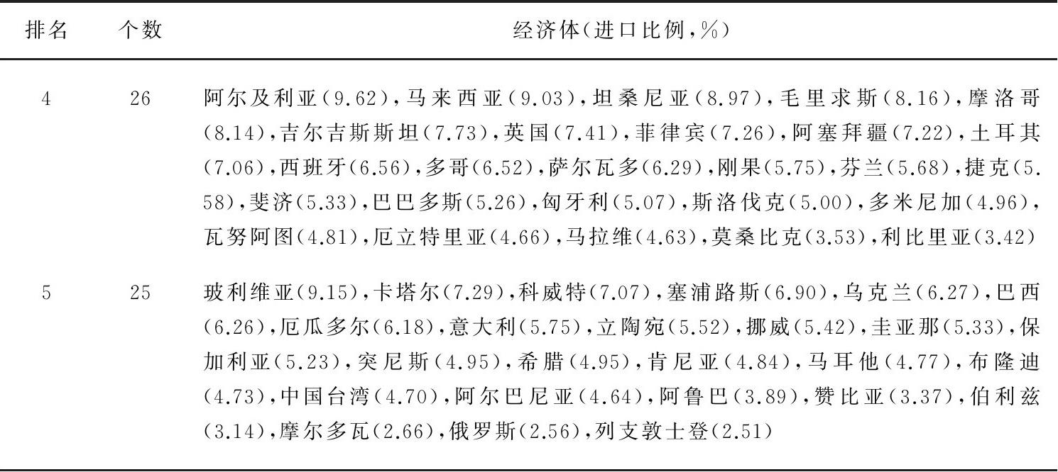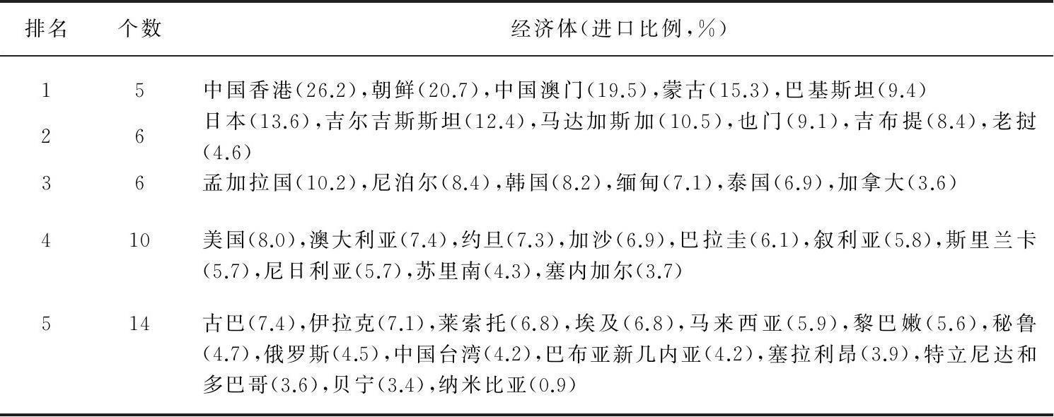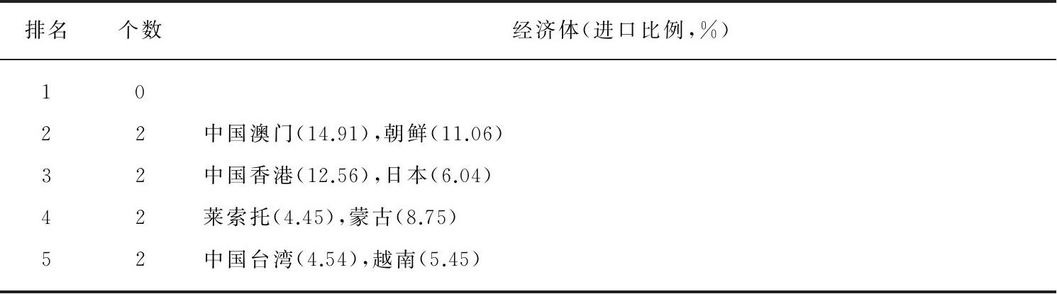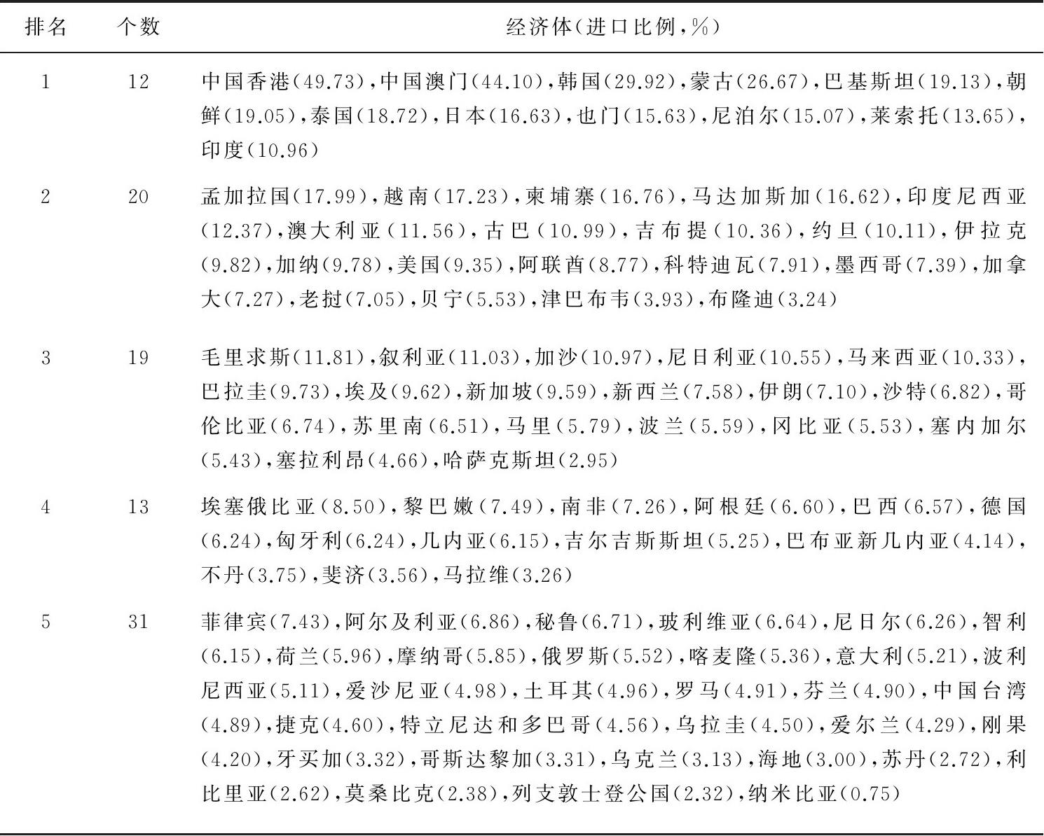 2013年,自中国进口中间品的样本经济体比例在该经济体所有进口来源地中排名第一的样本经济体数量达到12个,其中大部分为地理位置邻近中国内地、以贸易支撑经济或当地自然资源较为欠缺的经济体,如日本、中国香港、中国澳门等。排名第二的样本经济体数量为20个,包括澳大利亚、美国、加拿大等。排名第三至第五的经济体数量分别为19、13、31个,排名前五的经济体总计95个,占样本经济体数量的50.5%.