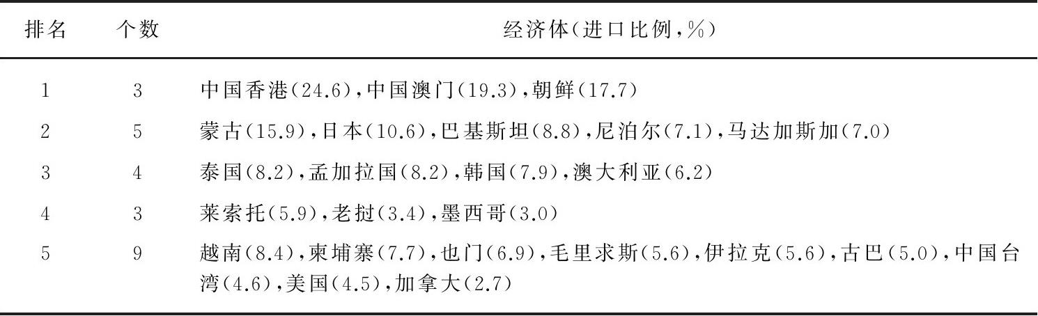 表1.1 1990年中国在该经济体最终消费品出口目的地中排名前十位的情况(中国作为进口方)