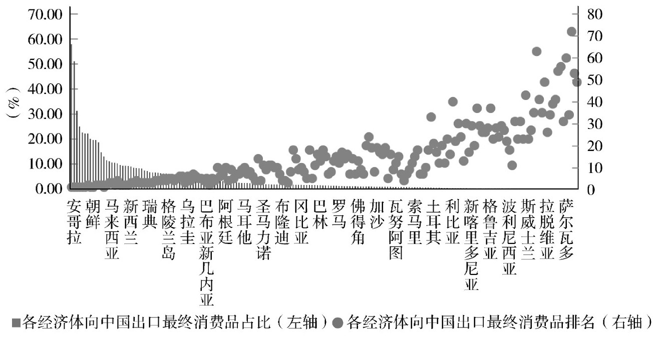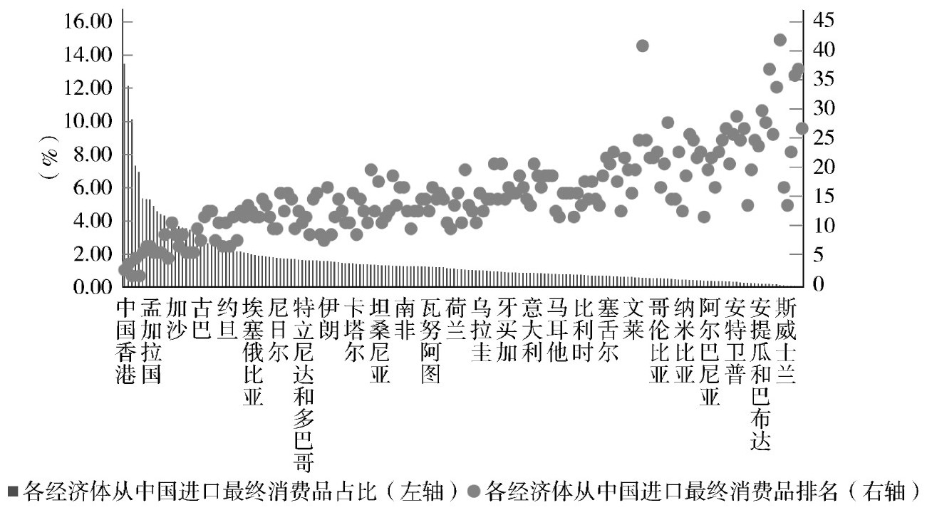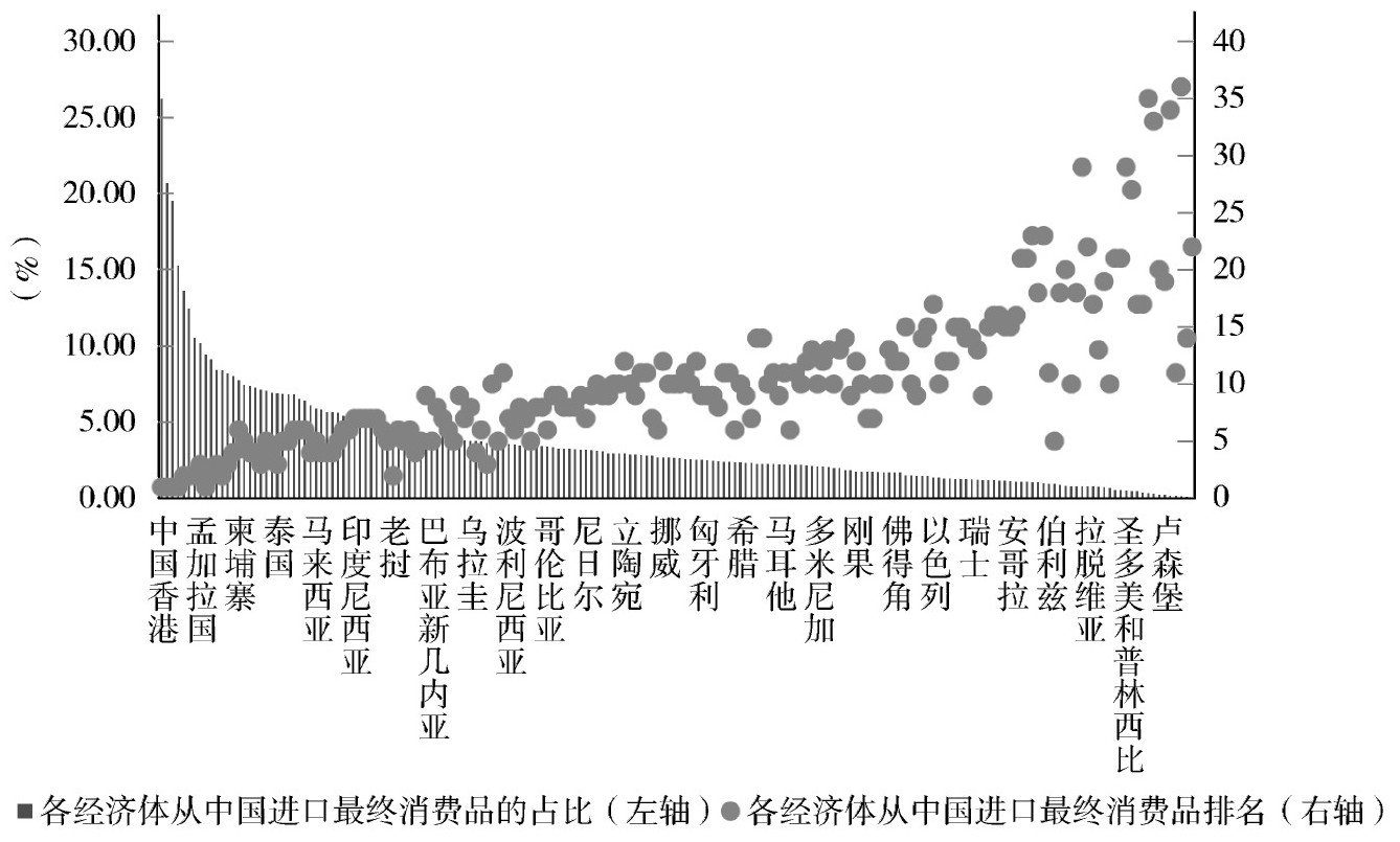 2013年,中国作为全球最终消费品出口目的地的地位继续巩固。对中国的出口额占其全部最终消费品出口额的比例在10%以上的样本经济体数量为18个,对中国的出口比例为1%—10%的经济体数量达到95个,比例在1%以下的经济体下降至75个。中国作为最终消费品出口目的地的地位在2000—2013年提升速度较为明显。